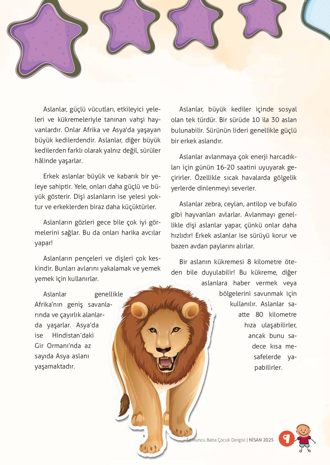 Aslanlar, güçlü vücutları, etkileyici yeleleri ve kükremeleriyle tanınan vahşi hayvanlardır. Onlar Afrika ve Asya'da yaşayan büyük kedilerdendir. Aslanlar, diğer büyük kedilerden farklı olarak yalnız değil, sürüler hâlinde yaşarlar. Erkek aslanlar büyük ve kabarık bir y...