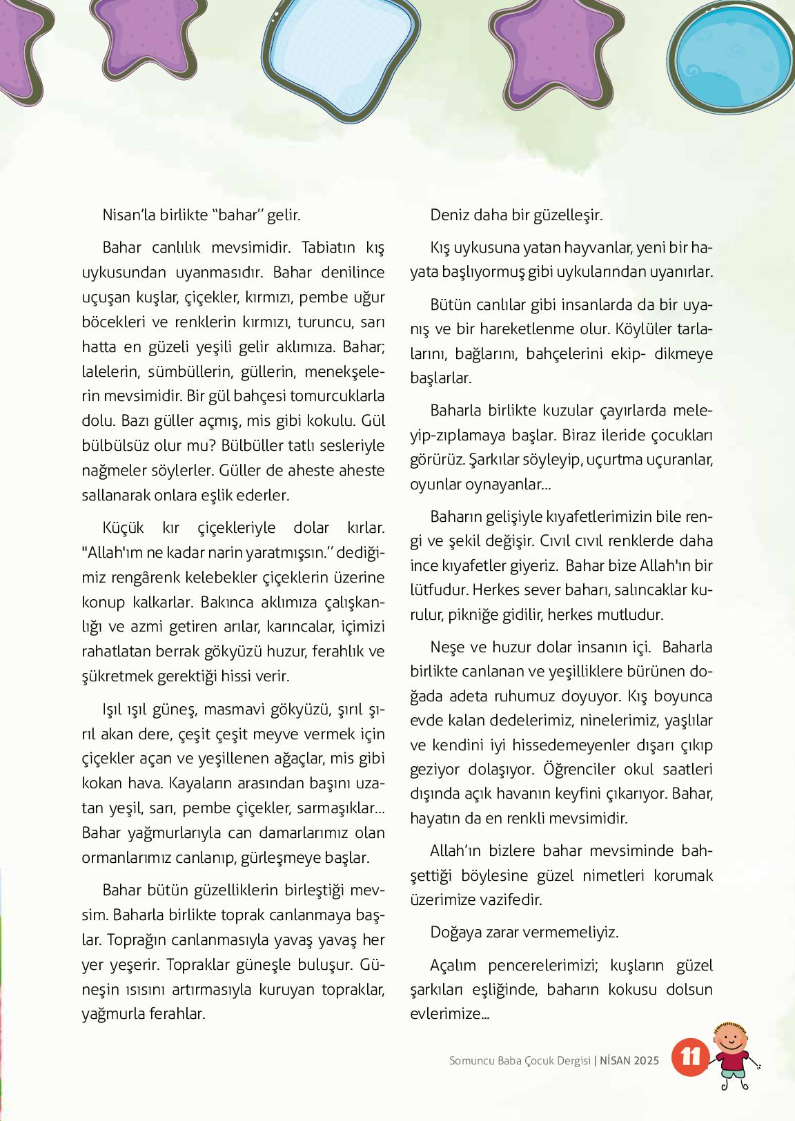 Nisan’la birlikte “bahar” gelir. Bahar canlılık mevsimidir. Tabiatın kış uykusundan uyanmasıdır. Bahar denilince uçuşan kuşlar, çiçekler, kırmızı, pembe uğur böcekleri ve renklerin kırmızı, turuncu, sarı hatta en güzeli yeşili gelir aklımıza. Bahar; lalelerin, sümbül...