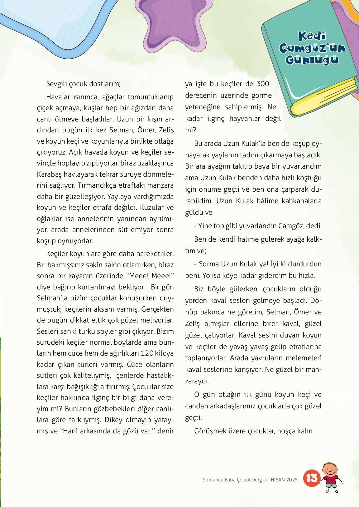 Sevgili çocuk dostlarım;Havalar ısınınca, ağaçlar tomurcuklanıp çiçek açmaya, kuşlar hep bir ağızdan daha canlı ötmeye başladılar. Uzun bir kışın ardından bugün ilk kez Selman, Ömer, Zeliş ve köyün keçi ve koyunlarıyla birlikte otlağa çıkıyoruz. Açık havada koyun ve keçiler ...