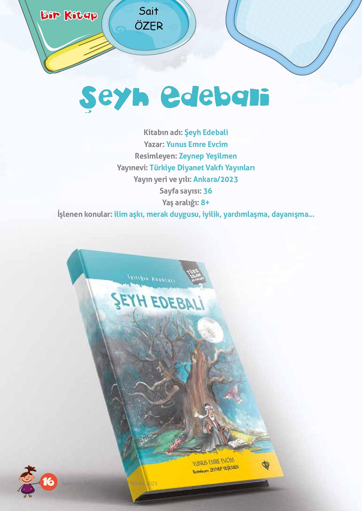 Kitabın adı: Şeyh EdebaliYazar: Yunus Emre EvcimResimleyen: Zeynep YeşilmenYayınevi: Türkiye Diyanet Vakfı YayınlarıYayın yeri ve yılı: Ankara/2023Sayfa sayısı: 36Yaş aralığı: 8+İşlenen konular: ilim aşkı, merak duygusu, iyilik, yardımlaşma, dayanışma…Bugün sizlerle ilim aşığı...