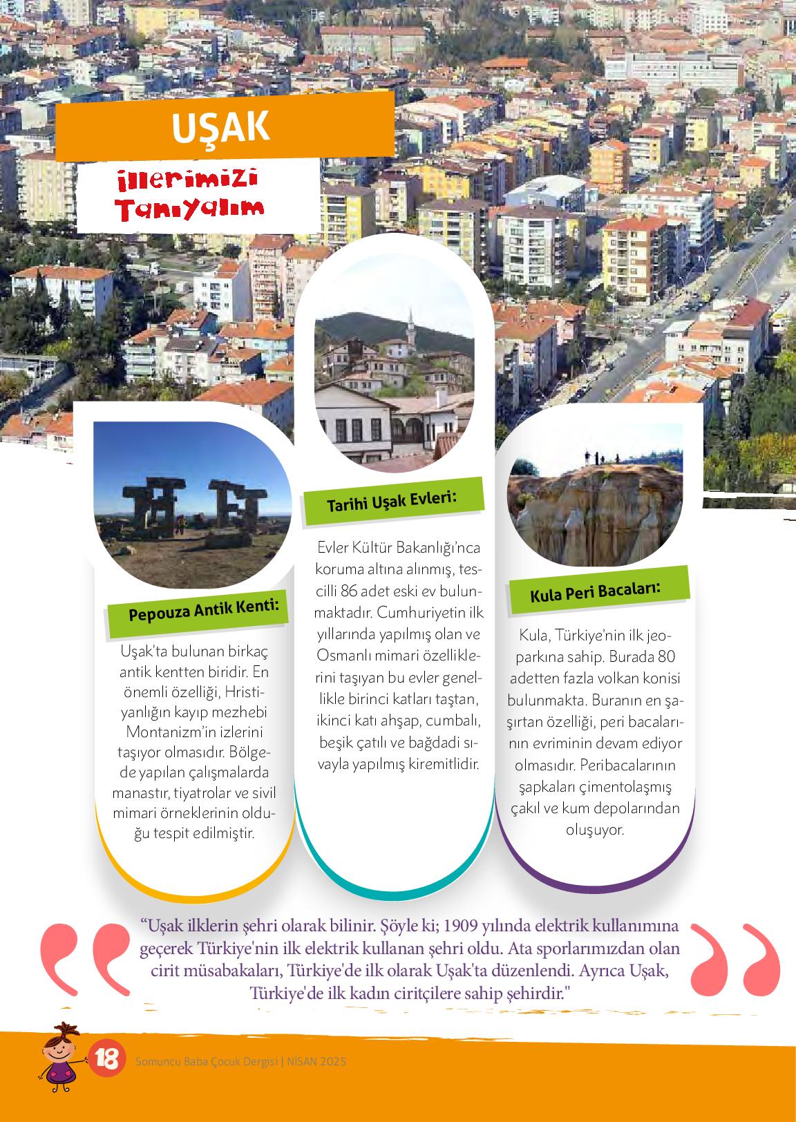 Uşak ilklerin şehri olarak bilinir. Şöyle ki; 1909 yılında elektrik kullanımına geçerek Türkiye'nin ilk elektrik kullanan şehri oldu. Ata sporlarımızdan olan cirit müsabakaları, Türkiye'de ilk olarak Uşak'ta düzenlendi. Ayrıca Uşak, Türkiye'de ilk kadın ciritçilere sahip şe...