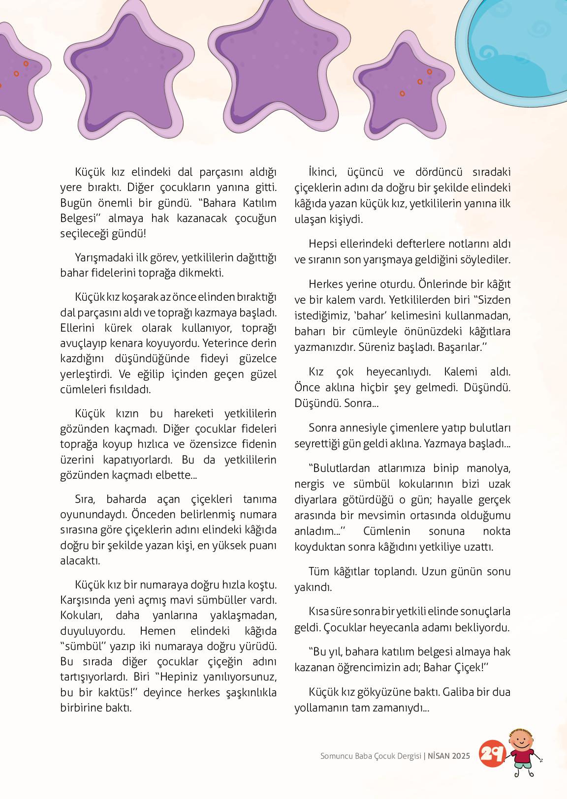 Küçük kız elindeki dal parçasını aldığı yere bıraktı. Diğer çocukların yanına gitti. Bugün önemli bir gündü. “Bahara Katılım Belgesi” almaya hak kazanacak çocuğun seçileceği gündü!Yarışmadaki ilk görev, yetkililerin dağıttığı bahar fidelerini toprağa dikmekti.Küçük kız koşarak az...