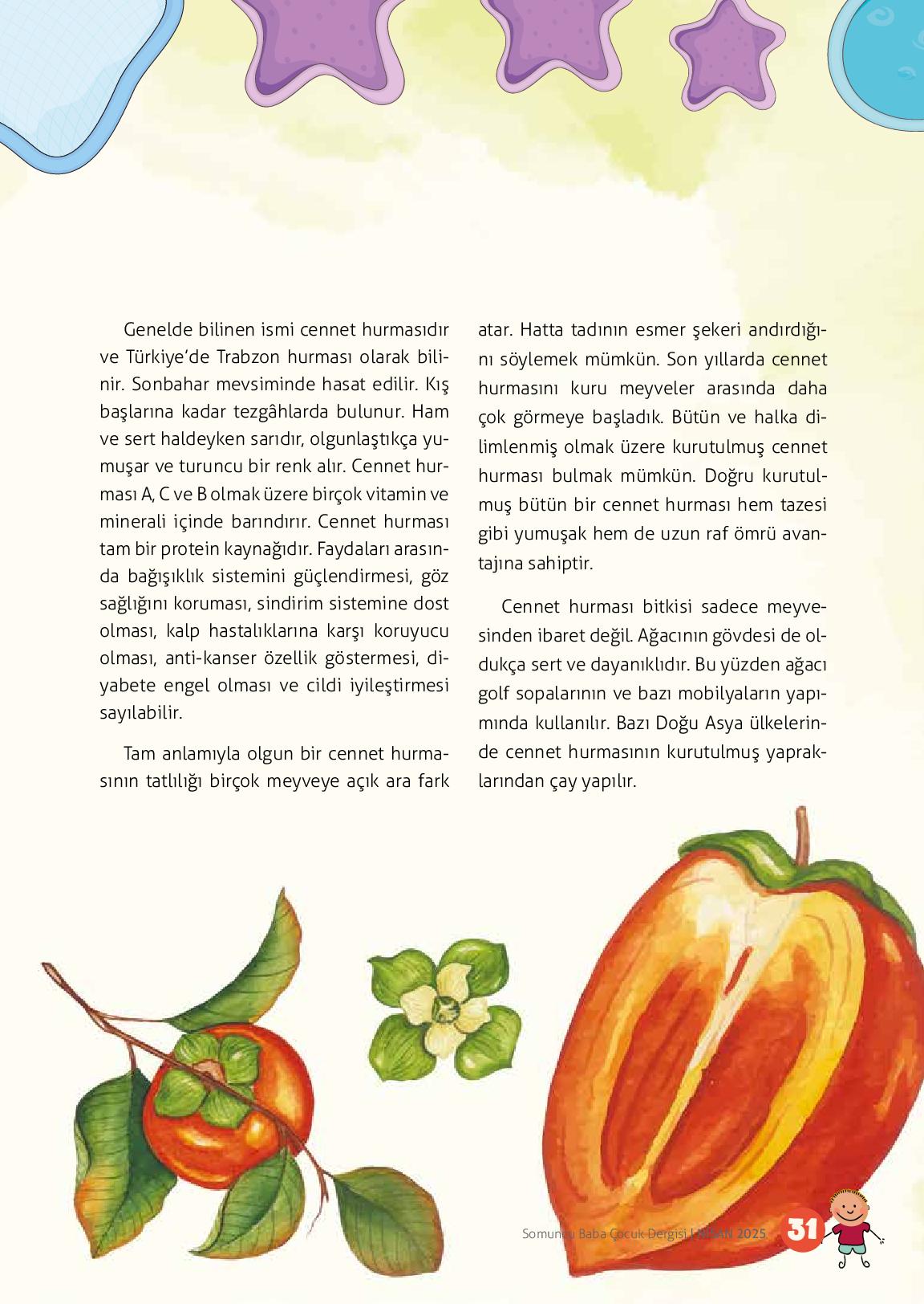 Genelde bilinen ismi cennet hurmasıdır ve Türkiye’de Trabzon hurması olarak bilinir. Sonbahar mevsiminde hasat edilir. Kış başlarına kadar tezgâhlarda bulunur. Ham ve sert haldeyken sarıdır, olgunlaştıkça yumuşar ve turuncu bir renk alır. Cennet hurması A, C ve B o...