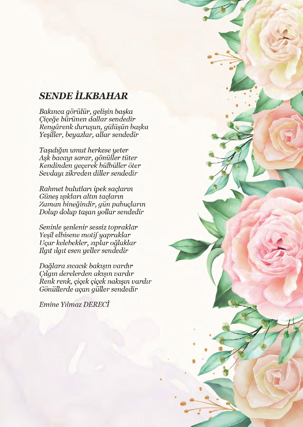 Bakınca görülür, gelişin başkaÇiçeğe bürünen dallar sendedirRengârenk duruşun, gülüşün başkaYeşiller, beyazlar, allar sendedirTaşıdığın umut herkese yeterAşk bacayı sarar, gönüller tüterKendinden geçerek bülbüller öterSevdayı zikreden diller sendedirRahmet bulutları ipek saçlarınGüneş ...
