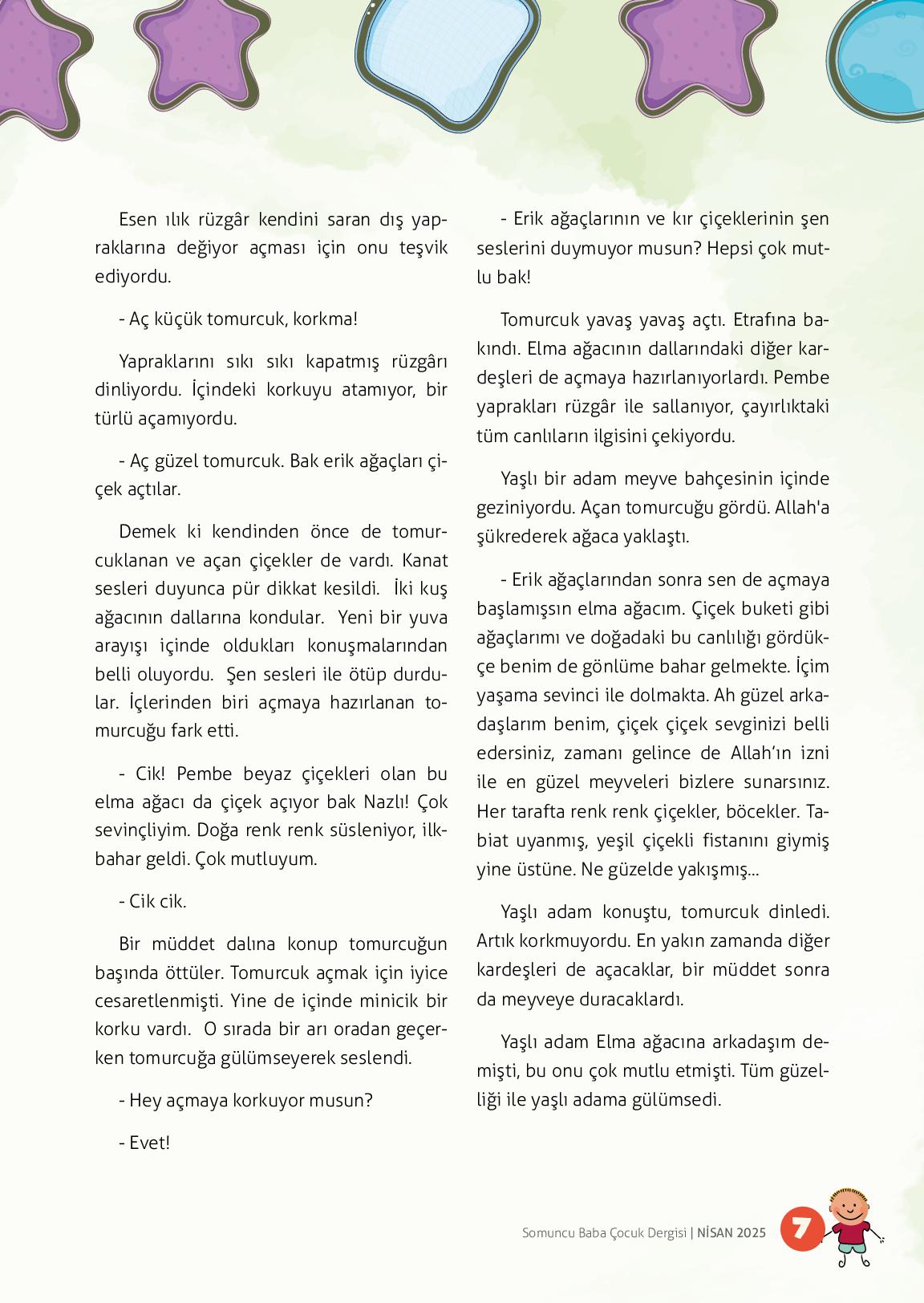 Esen ılık rüzgâr kendini saran dış yapraklarına değiyor açması için onu teşvik ediyordu.- Aç küçük tomurcuk, korkma!Yapraklarını sıkı sıkı kapatmış rüzgârı dinliyordu. İçinde ki korkuyu atamıyor, bir türlü açamıyordu.- Aç güzel tomurcuk. Bak erik ağaçları çiçek açtılar.Demek ki kendinden önc...