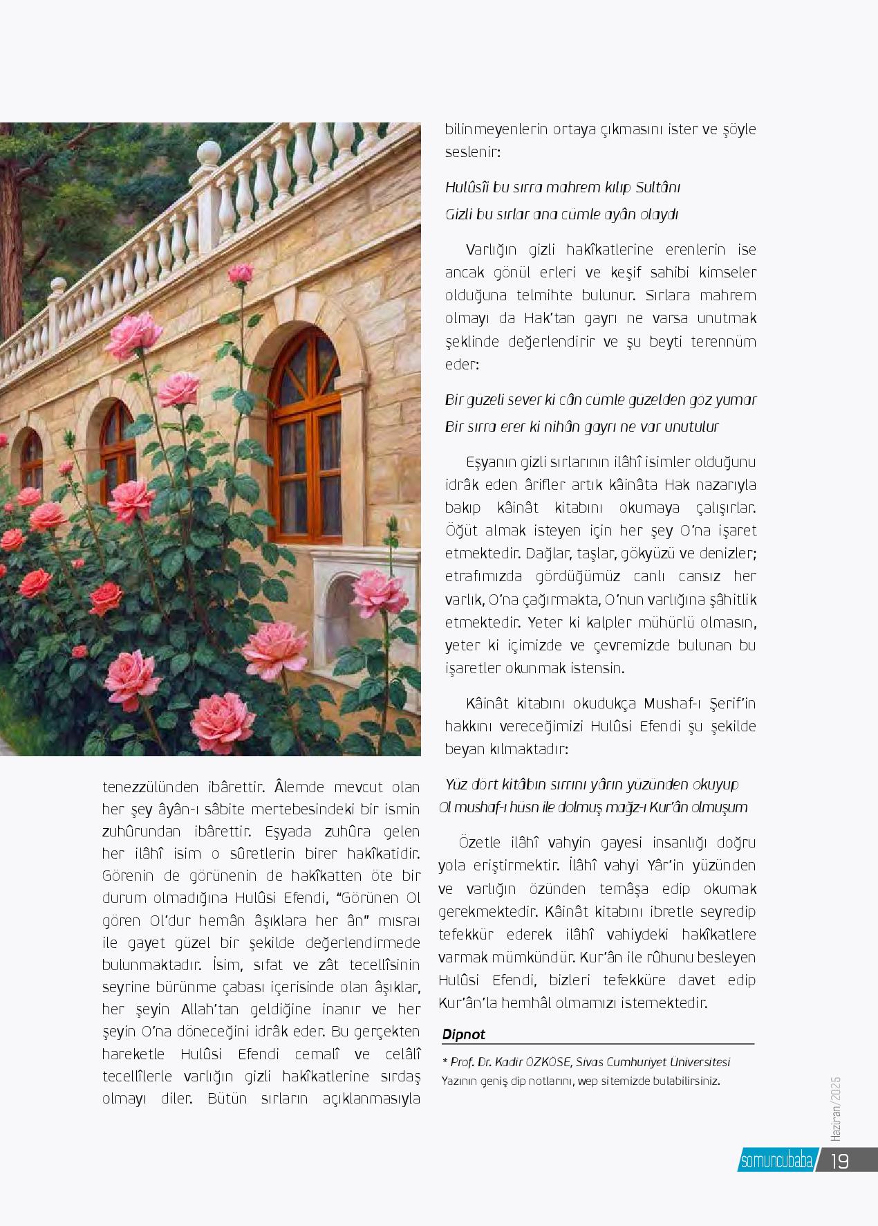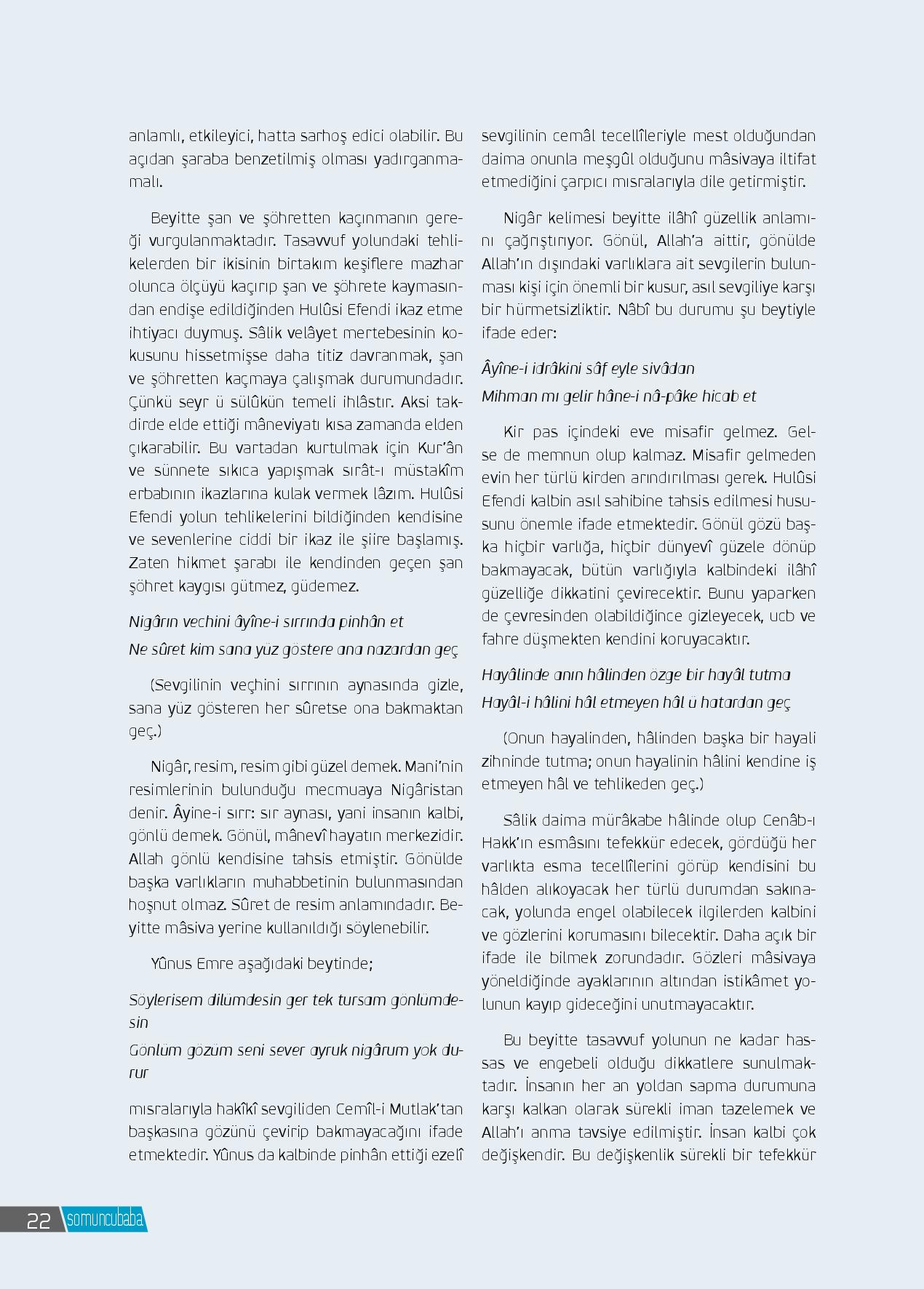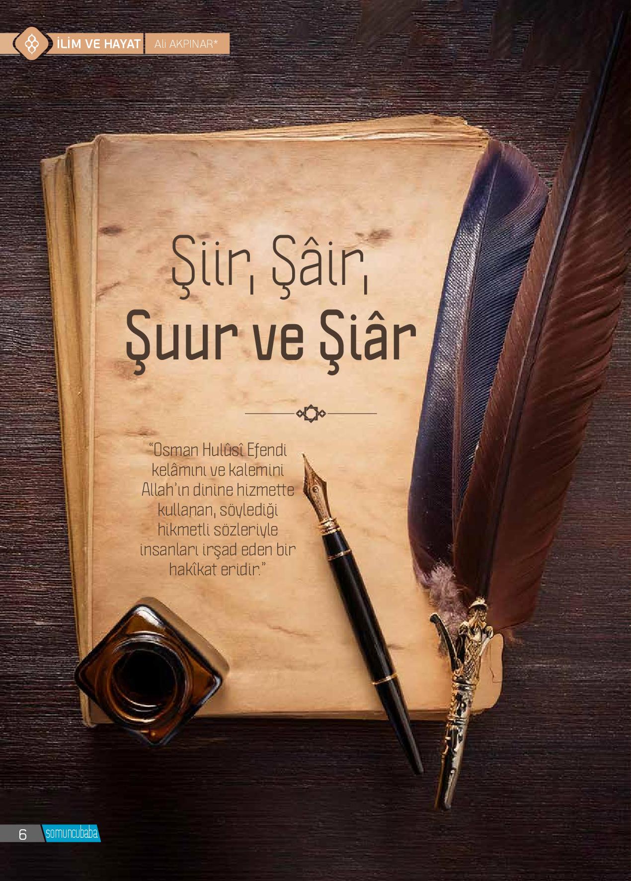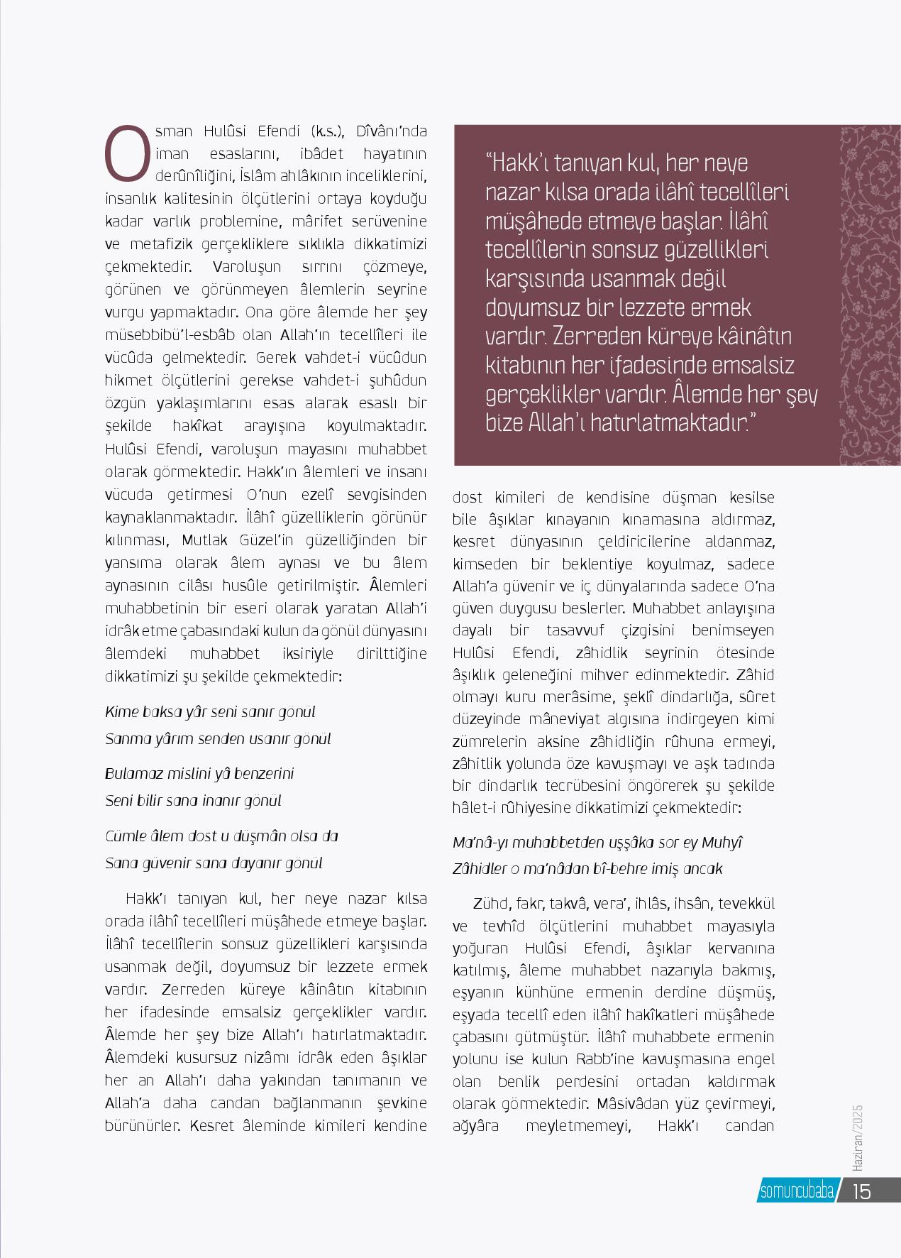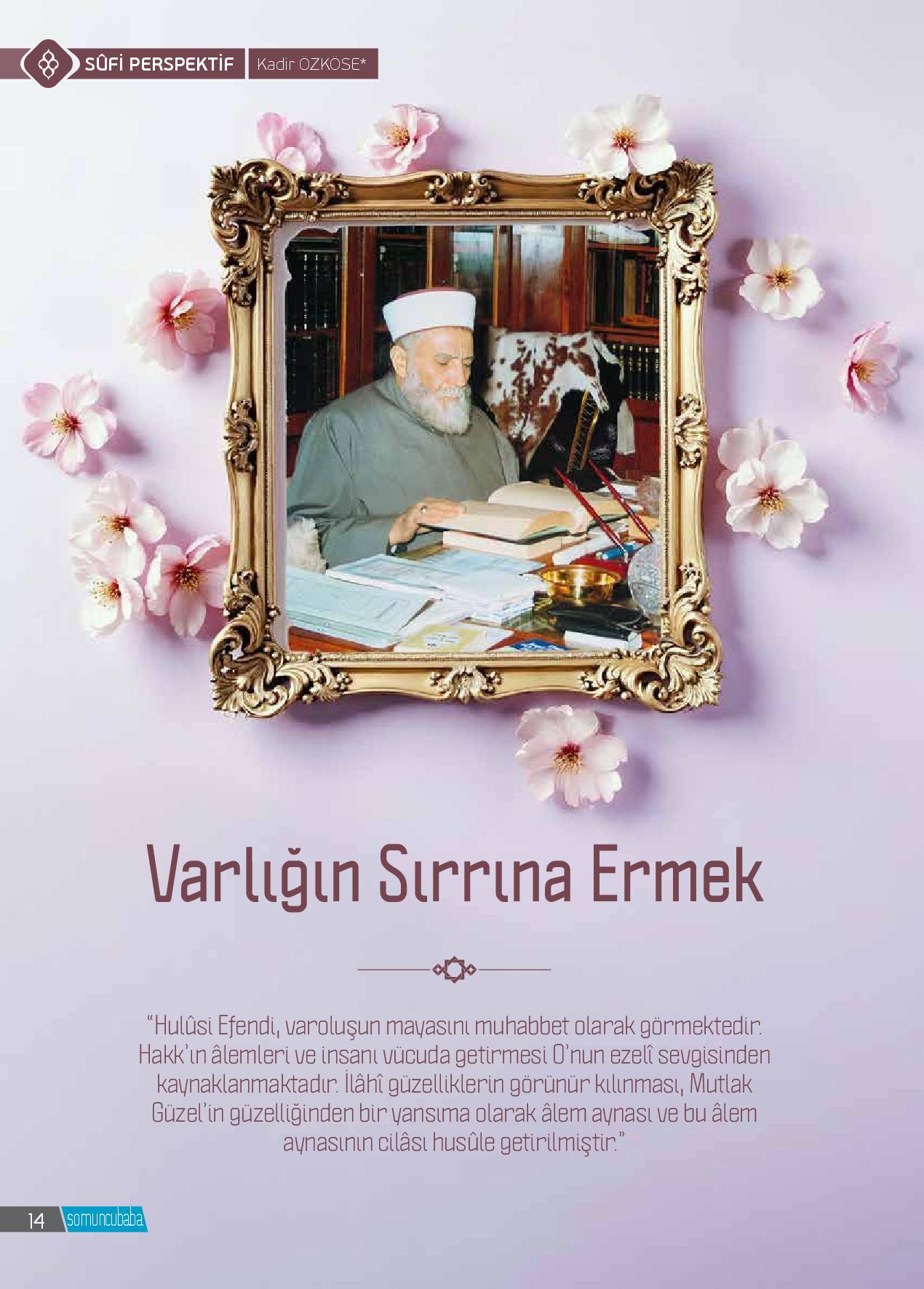 Osman Hulûsi Efendi (k.s.), Dîvânı’nda iman esaslarını, ibâdet hayatının derûnîliğini, İslâm ahlâkının inceliklerini, insanlık kalitesinin ölçütlerini ortaya koyduğu kadar varlık problemine, mârifet serüvenine ve metafizik gerçekliklere sıklıkla dikkatimizi çekmektedir. Varoluş...