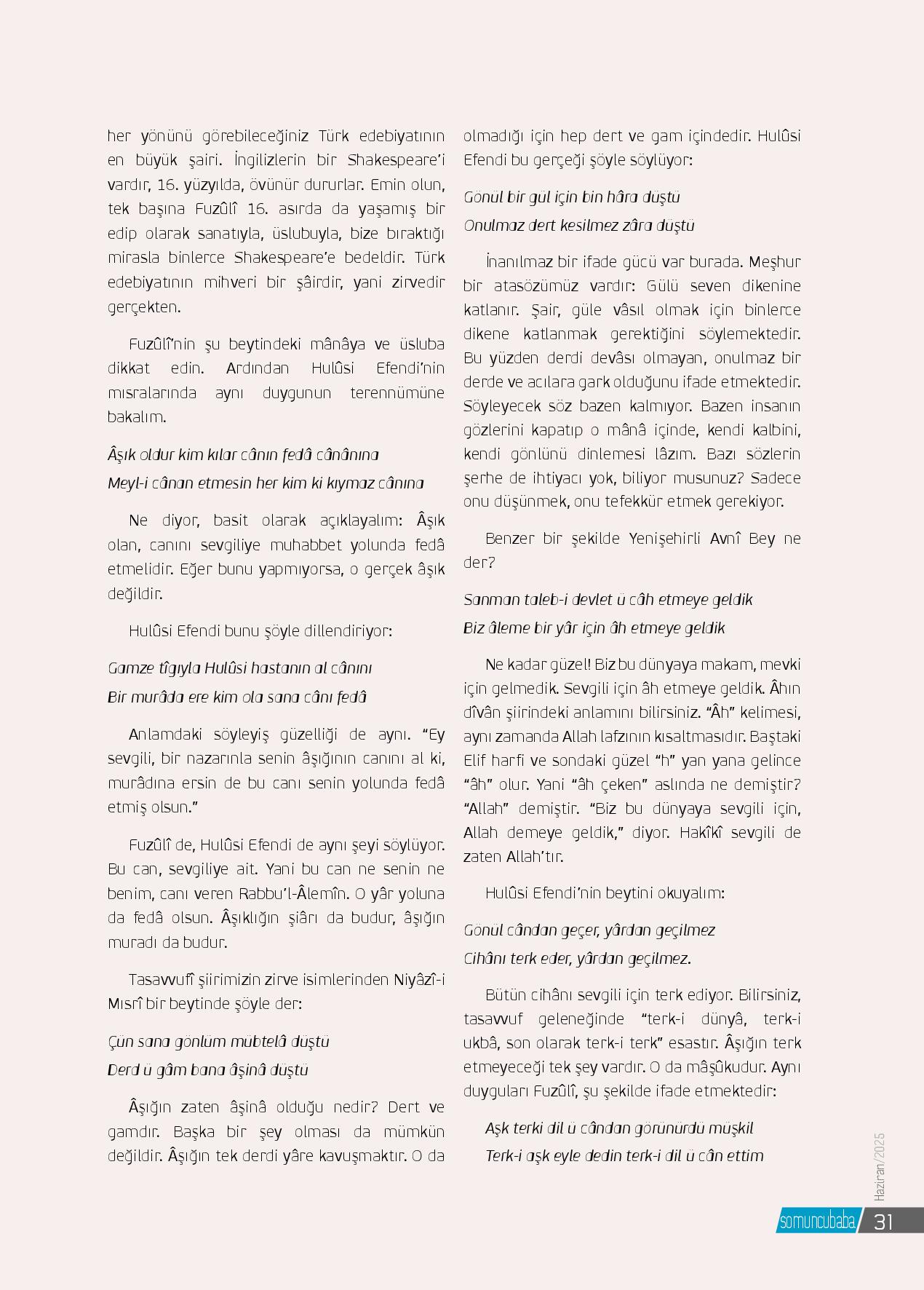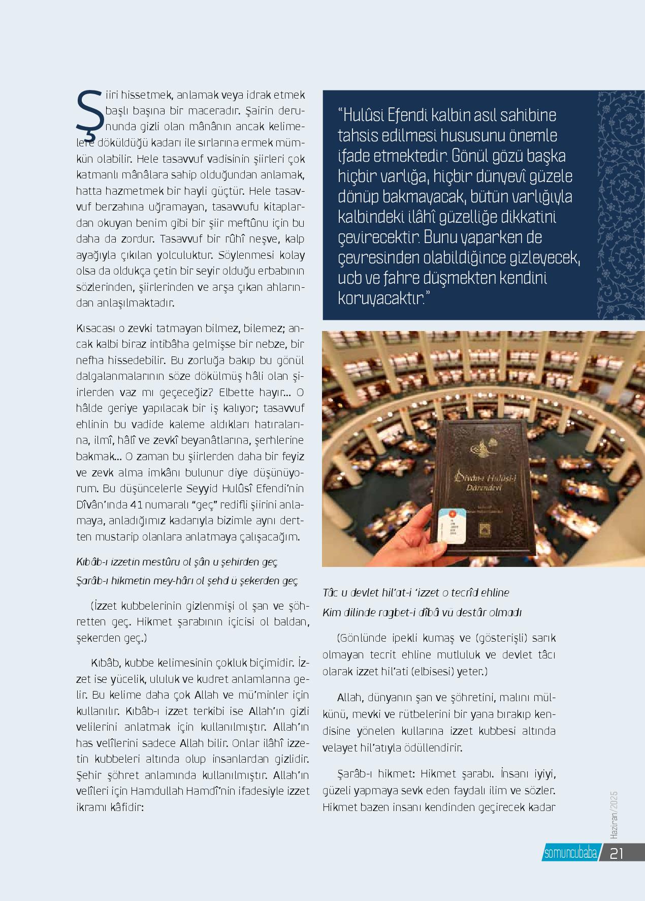 Şiiri hissetmek, anlamak veya idrak etmek başlı başına bir maceradır. Şairin derununda gizli olan mânânın ancak kelimelere döküldüğü kadarı ile sırlarına ermek mümkün olabilir. Hele tasavvuf vadisinin şiirleri çok katmanlı mânâlara sahip olduğundan anlamak, hatta hazmetmek...