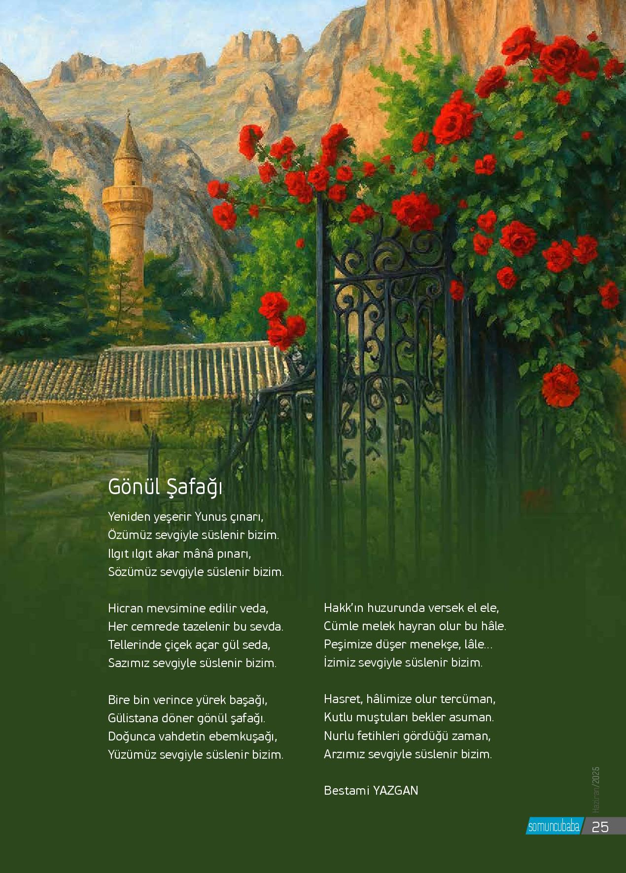 Yeniden yeşerir Yunus çınarı,Özümüz sevgiyle süslenir bizim.Ilgıt ılgıt akar mânâ pınarı,Sözümüz sevgiyle süslenir bizim.Hicran mevsimine edilir veda,Her cemrede tazelenir bu sevda.Tellerinde çiçek açar gül seda,Sazımız sevgiyle süslenir bizim.Bire bin verince yürek başağı,Gülistan...