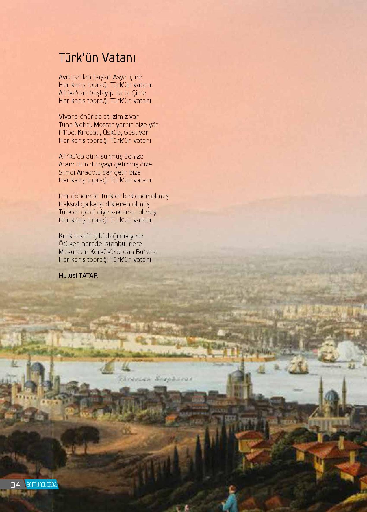 Avrupa’dan başlar Asya içineHer karış toprağı Türk’ün vatanı Afrika’dan başlayıp da ta Çin’eHer karış toprağı Türk’ün vatanıViyana önünde at izimiz varTuna Nehri, Mostar yardır bize yârFilibe, Kırcaali, Üsküp, GostivarHar karış toprağı Türk’ün vatanıAfrika’da atını sürmüş denizeA...