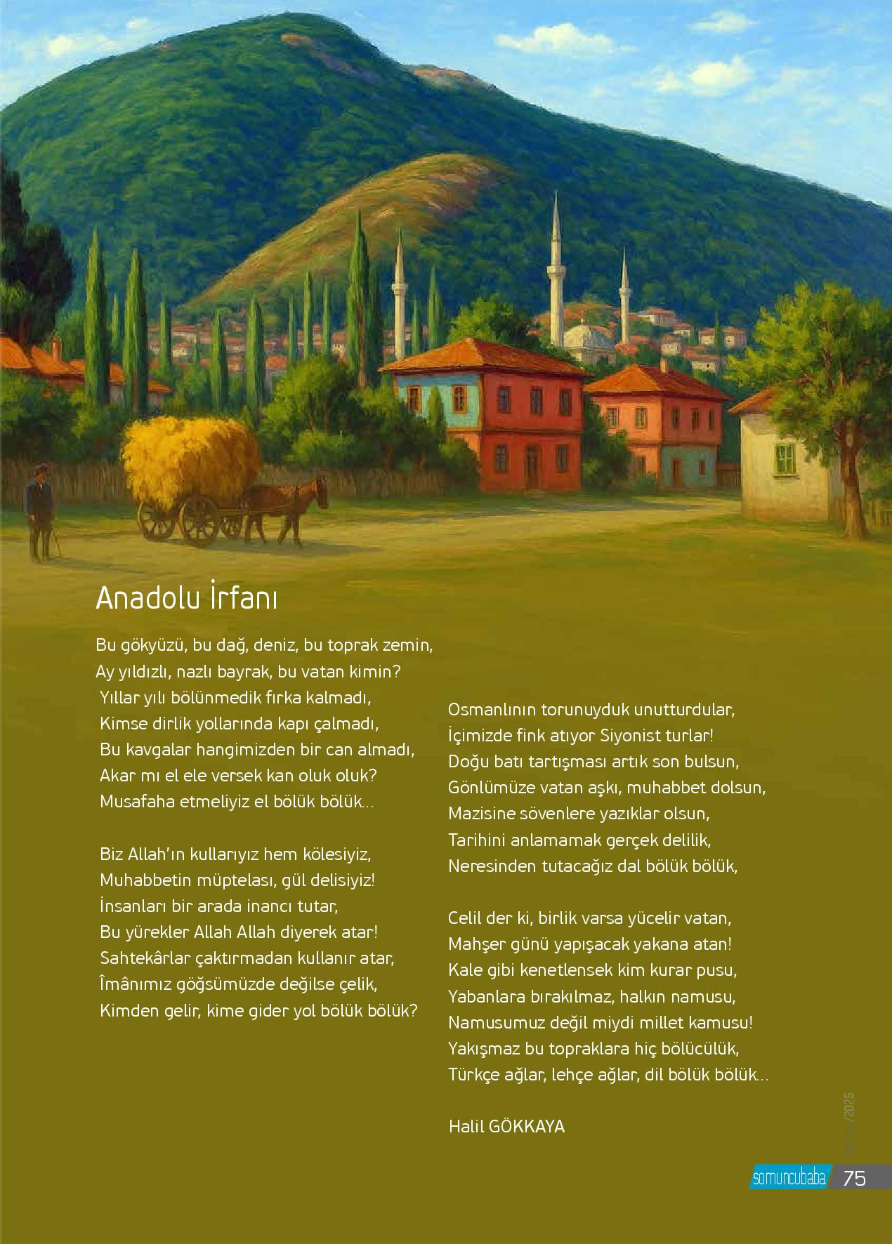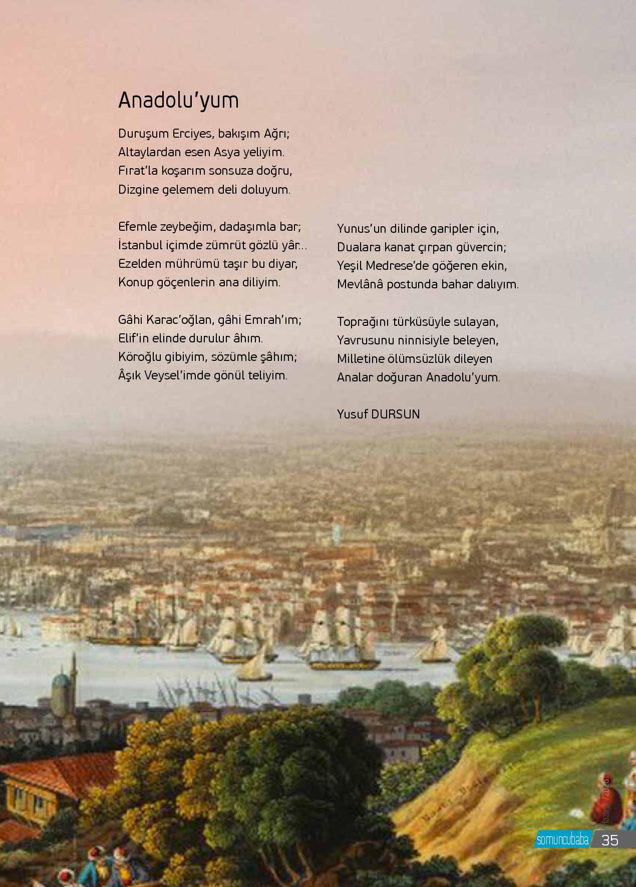 Duruşum Erciyes, bakışım Ağrı;Altaylardan esen Asya yeliyim.Fırat’la koşarım sonsuza doğru,Dizgine gelemem deli doluyum.Efemle zeybeğim, dadaşımla bar;İstanbul içimde zümrüt gözlü yâr…Ezelden mührümü taşır bu diyar,Konup göçenlerin ana diliyim.Gâhi Karac’oğlan, gâhi Emrah’ım;Elif’in...