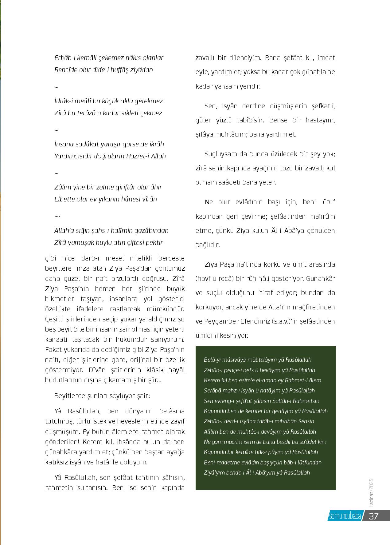 Ziyâ Paşa (1829-1880)Belâ-yı mâsivâya mübtelâyım yâ RasûlallahZebûn-ı pençe-i nefs ü hevâyım yâ RasûlallahKerem kıl ben esîm’e el-aman ey Rahmet-i âlemSerâpâ mahz-ı isyân ü hatâyım yâ RasûlallahSen evreng-i şefâ’at şâhısın Sultân-ı RahmetsinKapunda ben de kemter bir gedâyım yâ R...