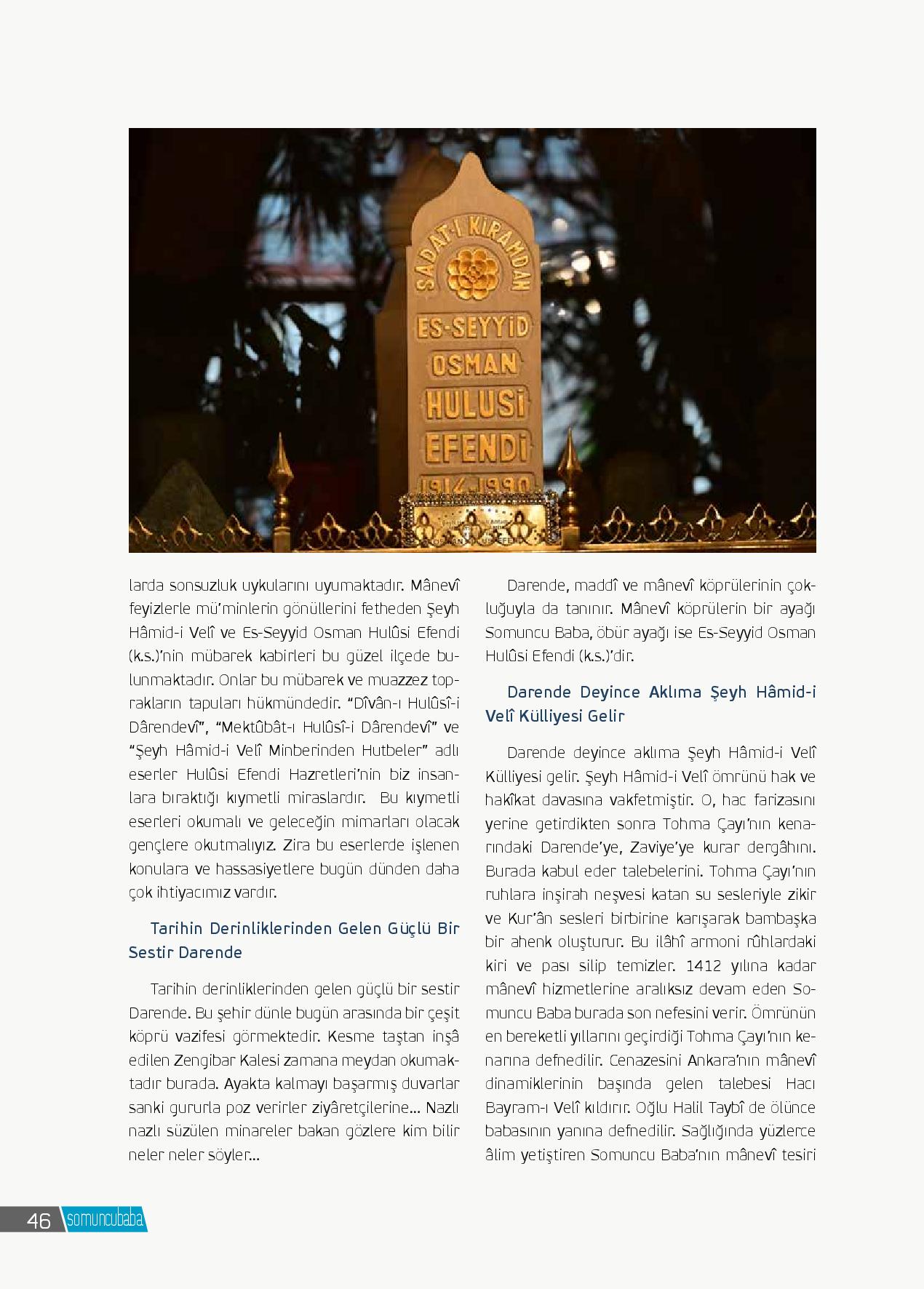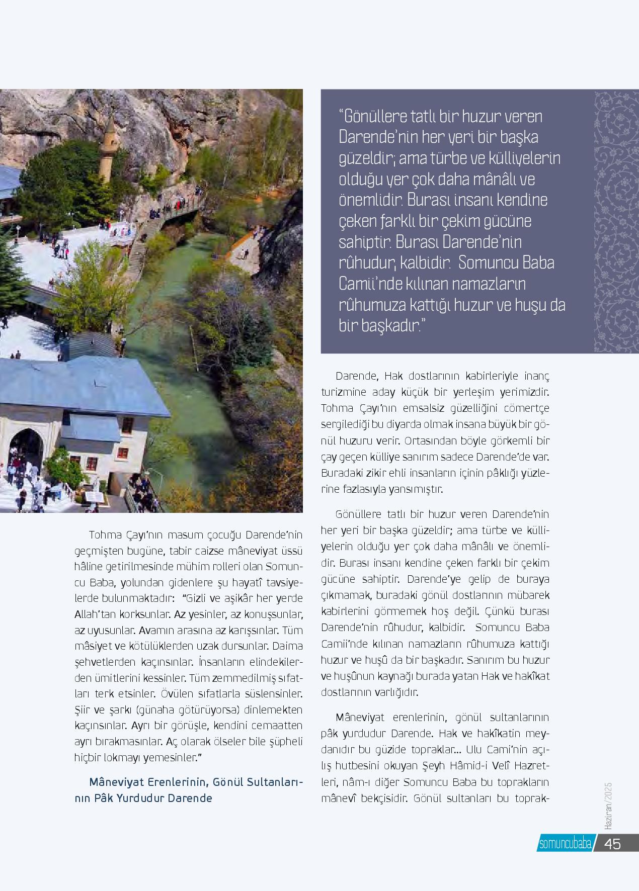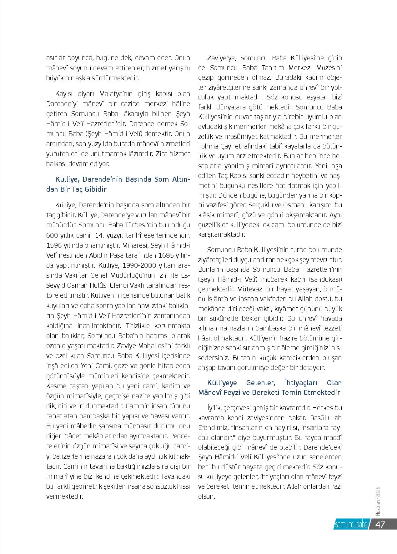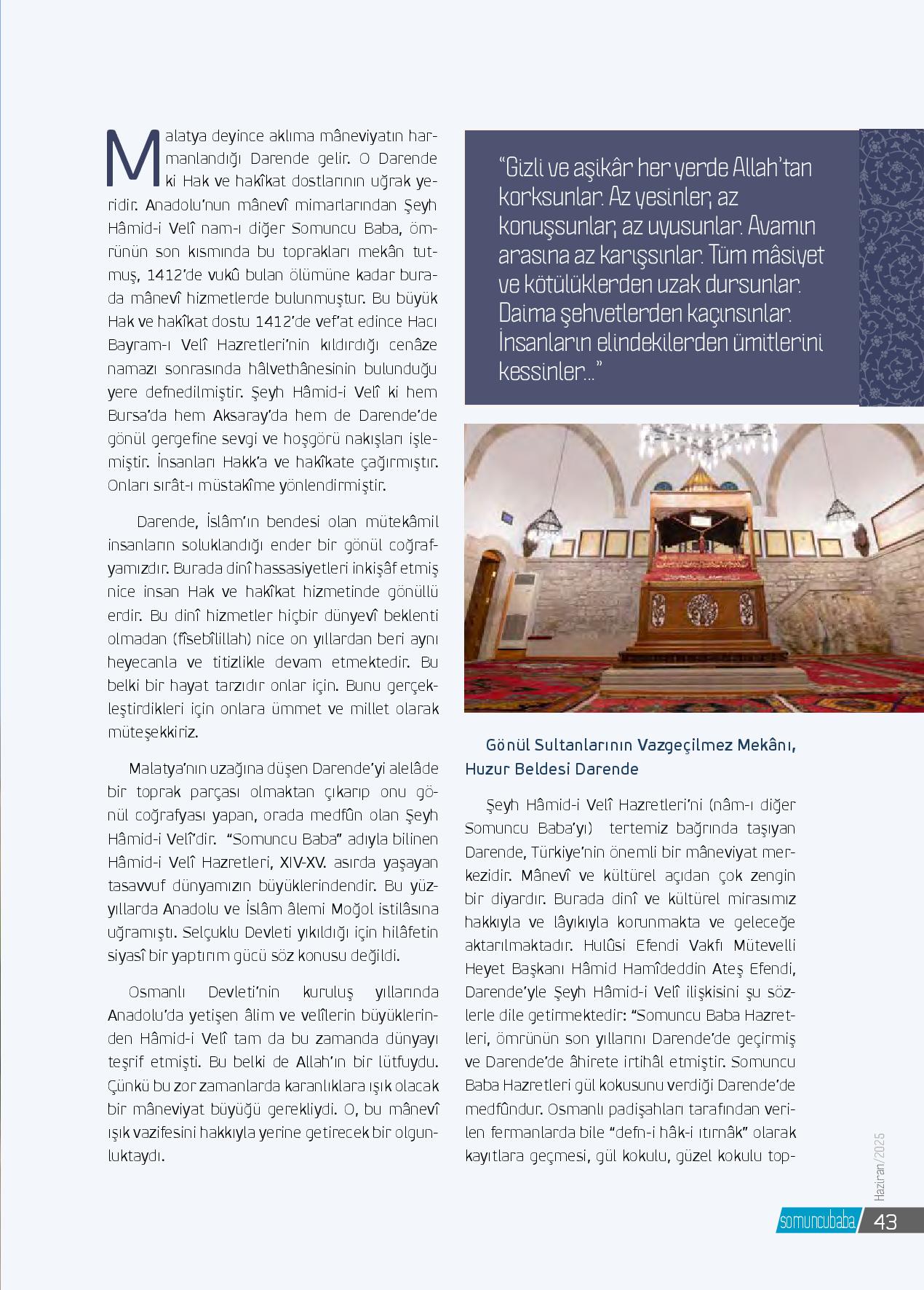 Malatya deyince aklıma mâneviyatın harmanlandığı Darende gelir. O Darende ki Hak ve hakîkat dostlarının uğrak yeridir. Anadolu'nun mânevî mimarlarından Şeyh Hâmid-i Velî nam-ı diğer Somuncu Baba, ömrünün son kısmında bu toprakları mekân...