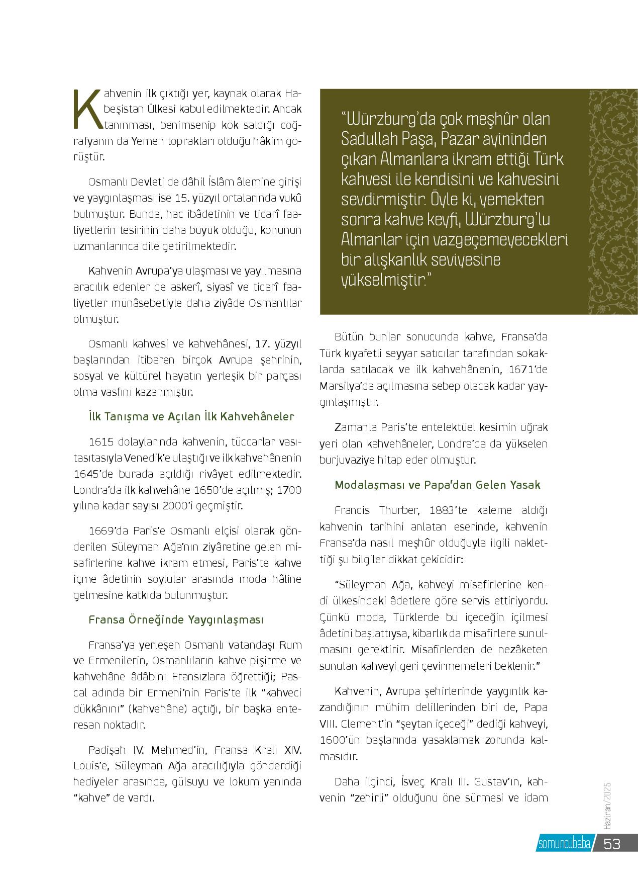 Kahvenin ilk çıktığı yer, kaynak olarak Habeşistan Ülkesi kabul edilmektedir. Ancak tanınması, benimsenip kök saldığı coğrafyanın da Yemen toprakları olduğu hâkim görüştür.Osmanlı Devleti de dâhil İslam âlemine girişi ve yaygınlaşma...