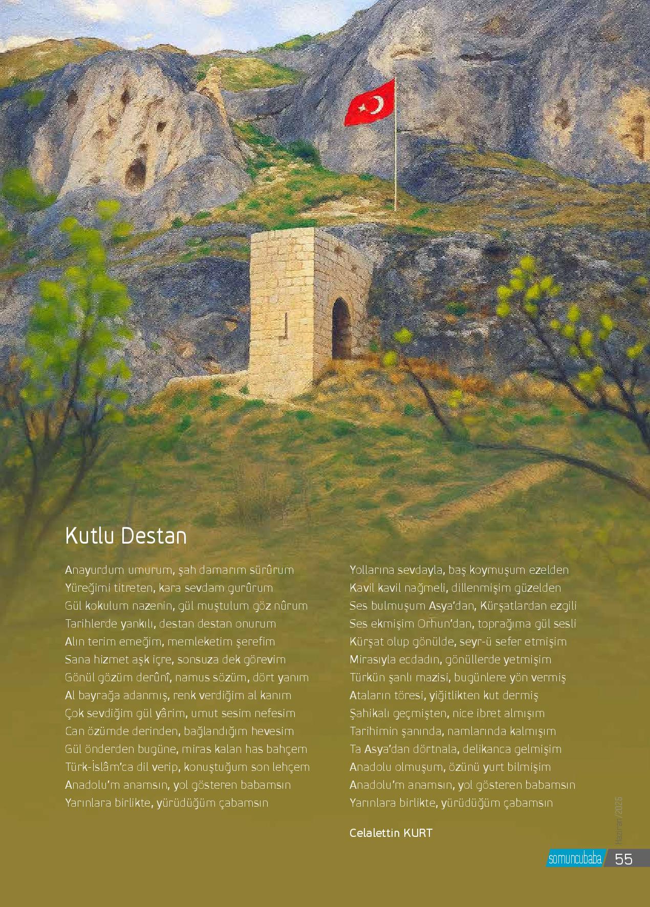 Anayurdum umurum, şah damarım sürûrumYüreğimi titreten, kara sevdam gurûrumGül kokulum nazenin, gül muştulum göz nûrumTarihlerde yankılı, destan destan onurumAlın terim emeğim, memleketim şerefimSana hizmet aşk içre, sonsuza dek görevimGönül gözüm derûnî, namus sözüm, dört yanımAl ...