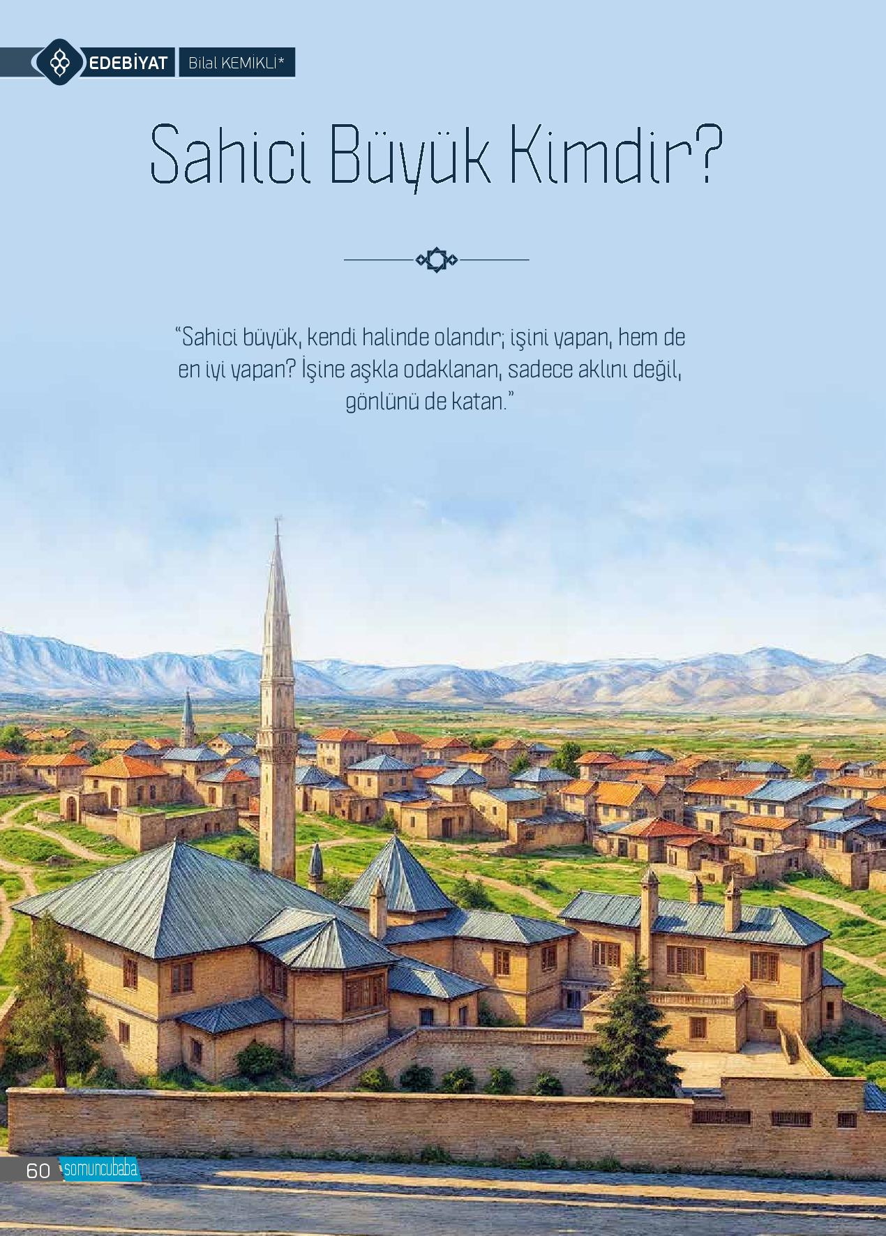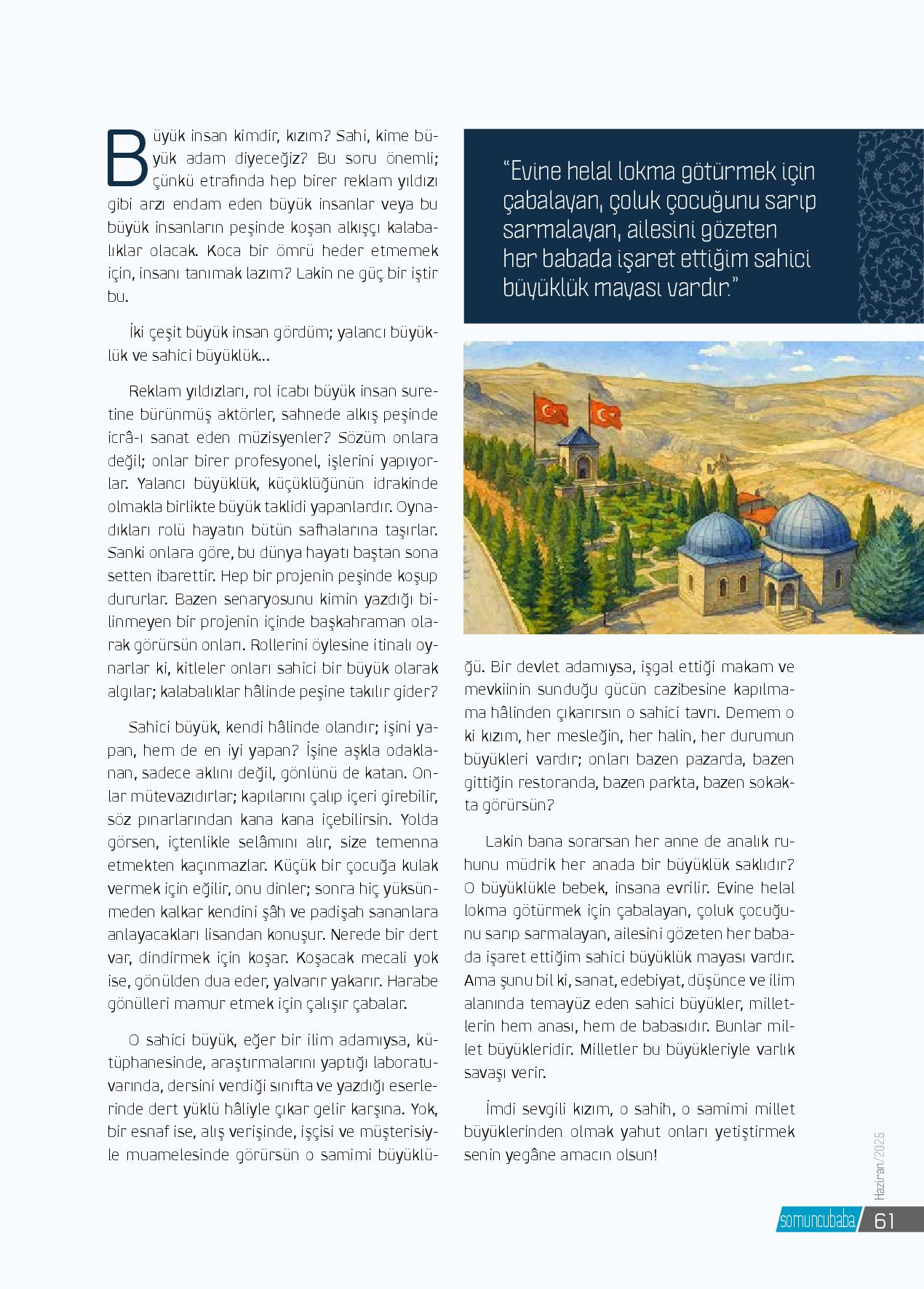 “Sahici büyük, kendi halinde olandır; işini yapan, hem de en iyi yapan? İşine aşkla odaklanan, sadece aklını değil, gönlünü de katan.”Büyük insan kimdir, kızım? Sahi, kime büyük adam diyeceğiz? Bu soru önemli; çünkü etrafında hep birer reklam yıldızı gibi arzı endam eden büyük in...