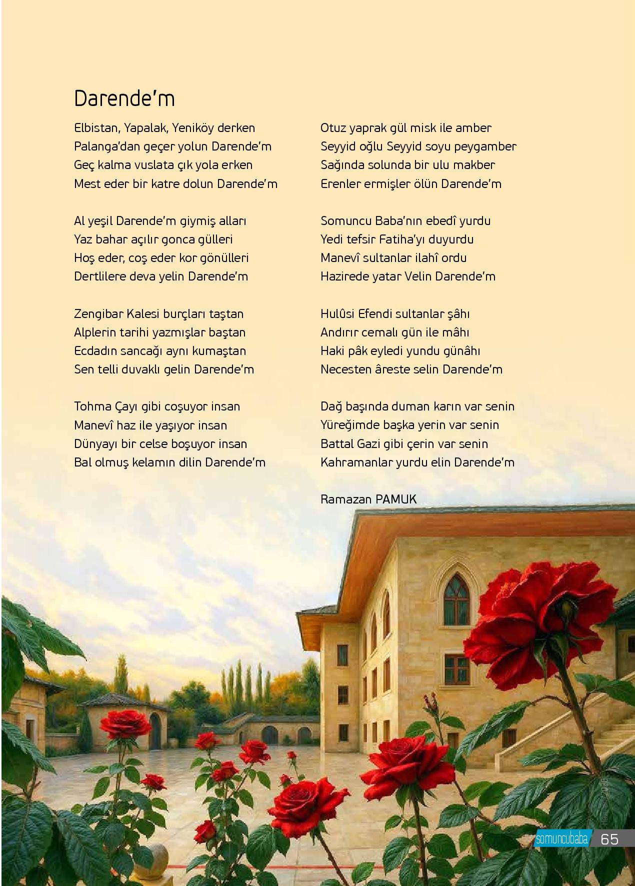 Elbistan, Yapalak, Yeniköy derkenPalanga’dan geçer yolun Darende’mGeç kalma vuslata çık yola erkenMest eder bir katre dolun Darende’mAl yeşil Darende’m giymiş allarıYaz bahar açılır gonca gülleriHoş eder, coş eder kor gönülleriDertlilere deva yelin Darende’mZengibar Kalesi burçları ta...