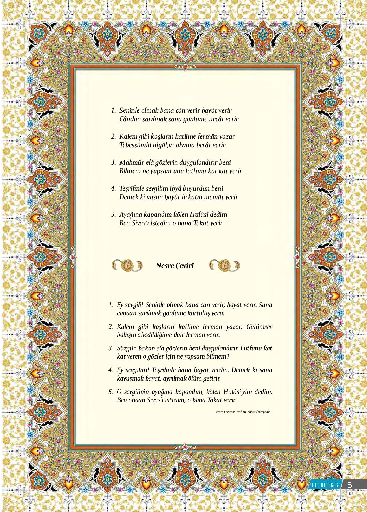 1. Seninle olmak bana cân verir hayât verirCândan sarılmak sana gönlüme necât verir2. Kalem gibi kaşların katlime fermân yazarTebessümlü nigâhın afvıma berât verir3. Mahmûr elâ gözlerin duygulandırır beniBilmem ne yapsam ana lutfunu kat kat ver...