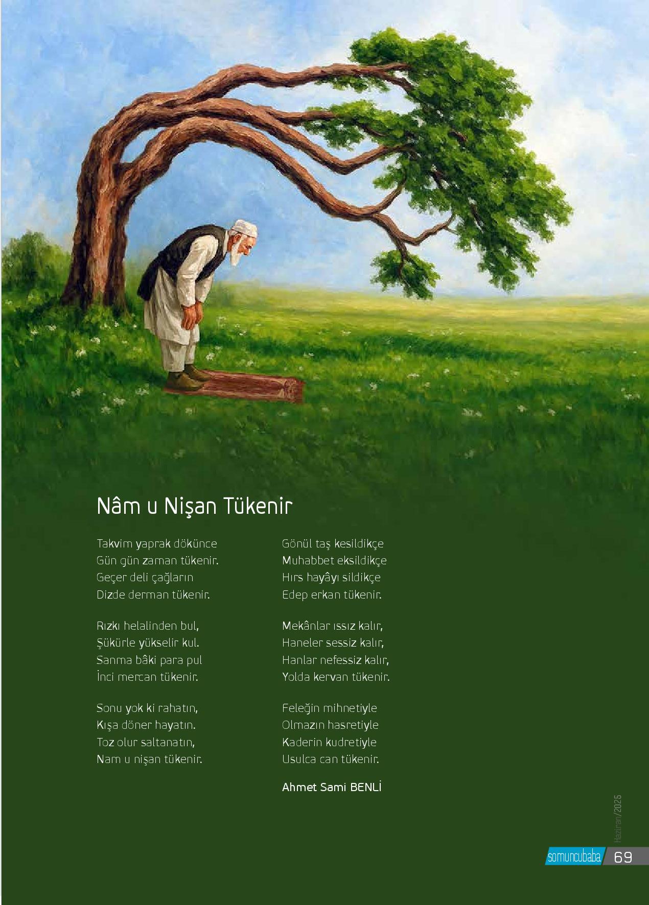 Takvim yaprak dökünceGün gün zaman tükenir.Geçer deli çağlarınDizde derman tükenir.Rızkı helalinden bul,Şükürle yükselir kul.Sanma bâki para pulİnci mercan tükenir.Sonu yok ki rahatın,Kışa döner hayatın.Toz olur saltanatın,Nam u nişan tükenir.Gönül taş kesildikçeMuhabbet eksildikç...