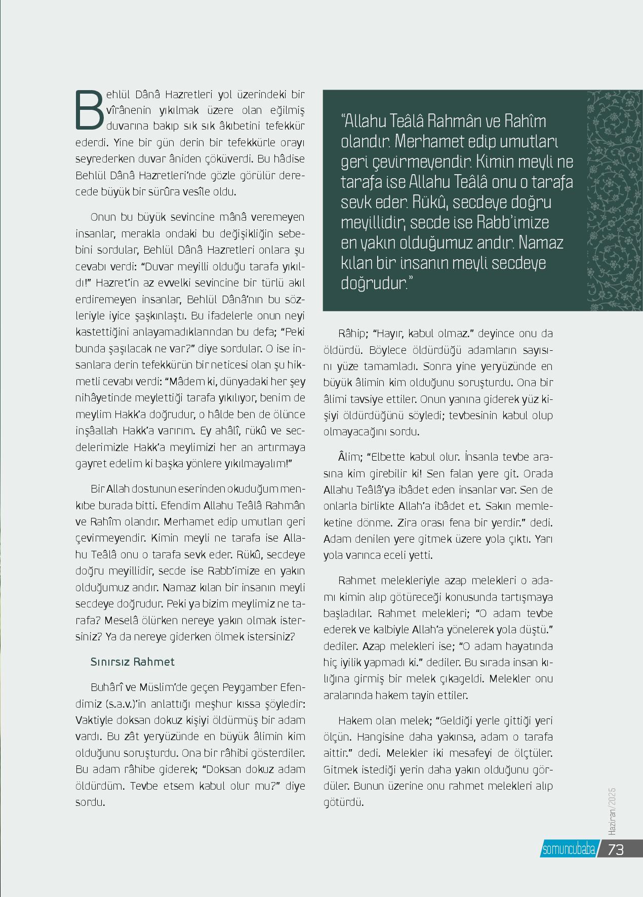 Behlül Dânâ Hazretleri yol üzerindeki bir vîrânenin yıkılmak üzere olan eğilmiş duvarına bakıp sık sık âkıbetini tefekkür ederdi. Yine bir gün derin bir tefekkürle orayı seyrederken duvar âniden çöküverdi. Bu hâdise Behlül Dânâ Hazretleri’nde gözle görülür derecede büyük bir sür...