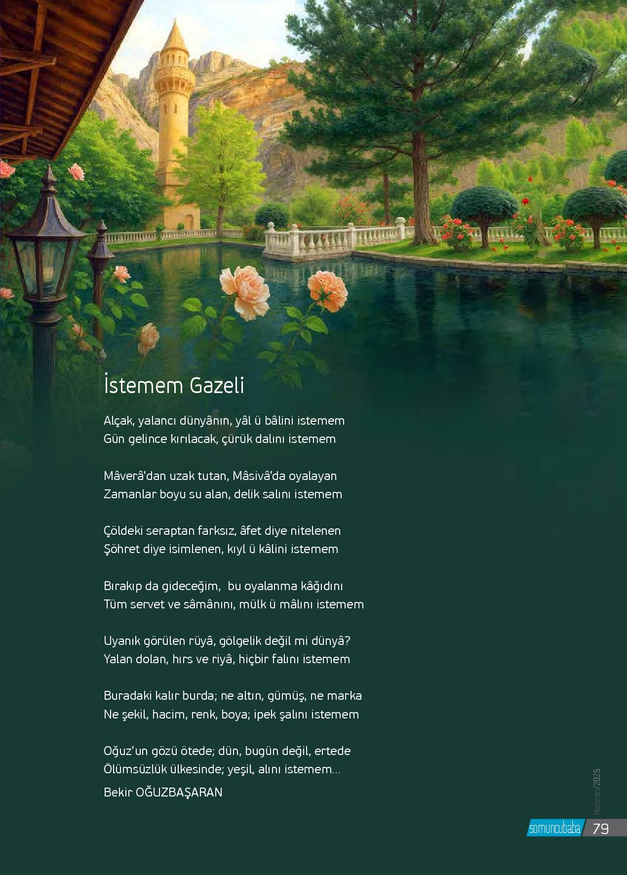 Alçak, yalancı dünyânın, yâl ü bâlini istememGün gelince kırılacak, çürük dalını istememMâverâ’dan uzak tutan, Mâsivâ’da oyalayanZamanlar boyu su alan, delik salını istememÇöldeki seraptan farksız, âfet diye nitelenenŞöhret diye isimlenen, kıyl ü kâlini istememBırakıp da gideceğim, bu ...