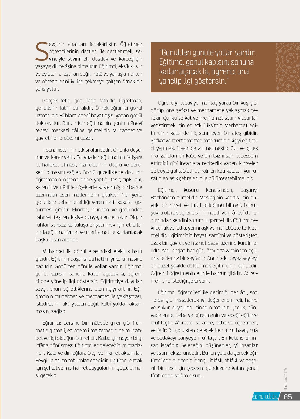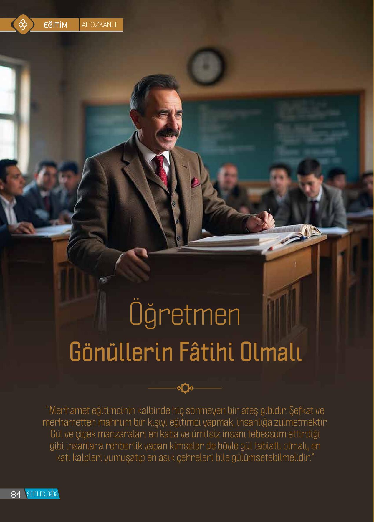 Sevginin anahtarı fedakârlıktır. Öğretmen öğrencilerinin dertleri ile dertlenmeli, sevinciyle sevinmeli, dostluk ve kardeşliğin yaşayış diline âşina olmalıdır. Eğitimci eksik kusur ve ayıpları araştıran değil, hata ve yanlışları örten ve öğrencilerini iyiliğe çekmeye...