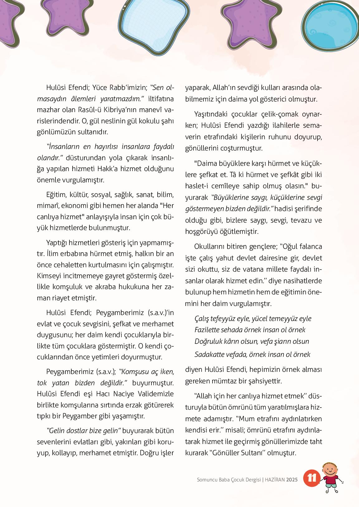 Hulûsi Efendi; Yüce Rabb’imizin; “Sen olmasaydın âlemleri yaratmazdım.” iltifatına mazhar olan Rasûl-ü Kibriya’nın manevî varislerindendir. O, gül neslinin gül kokulu şahı gönlümüzün sultanıdır.“İnsanların en hayırlısı insanlara faydalı olandır.” düsturu...