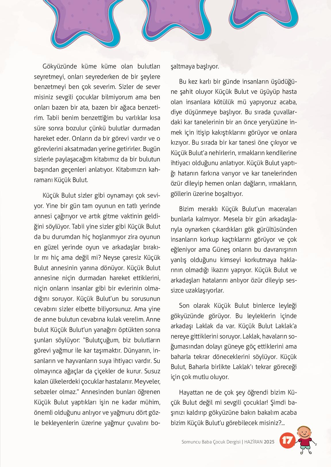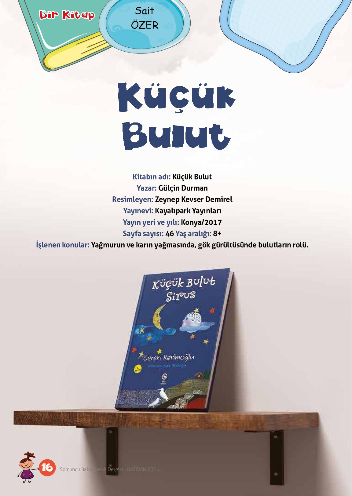 Kitabın adı: Küçük BulutYazar: Gülçin DurmanResimleyen: Zeynep Kevser DemirelYayınevi: Kayalıpark YayınlarıYayın yeri ve yılı: Konya/2017Sayfa sayısı: 46Yaş aralığı: 8+İşlenen konular: Yağmurun ve karın yağmasında, gök gürültüsünde bulutların rolü.Gökyüzünde küme küme ola...