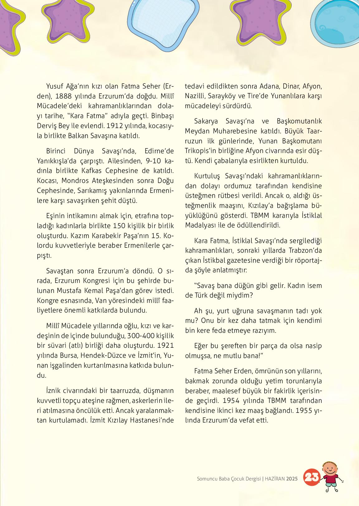 Yusuf Ağa’nın kızı olan Fatma Seher (Erden), 1888 yılında Erzurum’da doğdu. Millî Mücadele’deki kahramanlıklarından dolayı tarihe, “Kara Fatma” adıyla geçti. Binbaşı Derviş Bey ile evlendi. 1912 yılında, kocasıyla birlikte Balkan Savaşına katıldı.Birinci Dünya Savaşı’nda, Edirne’d...