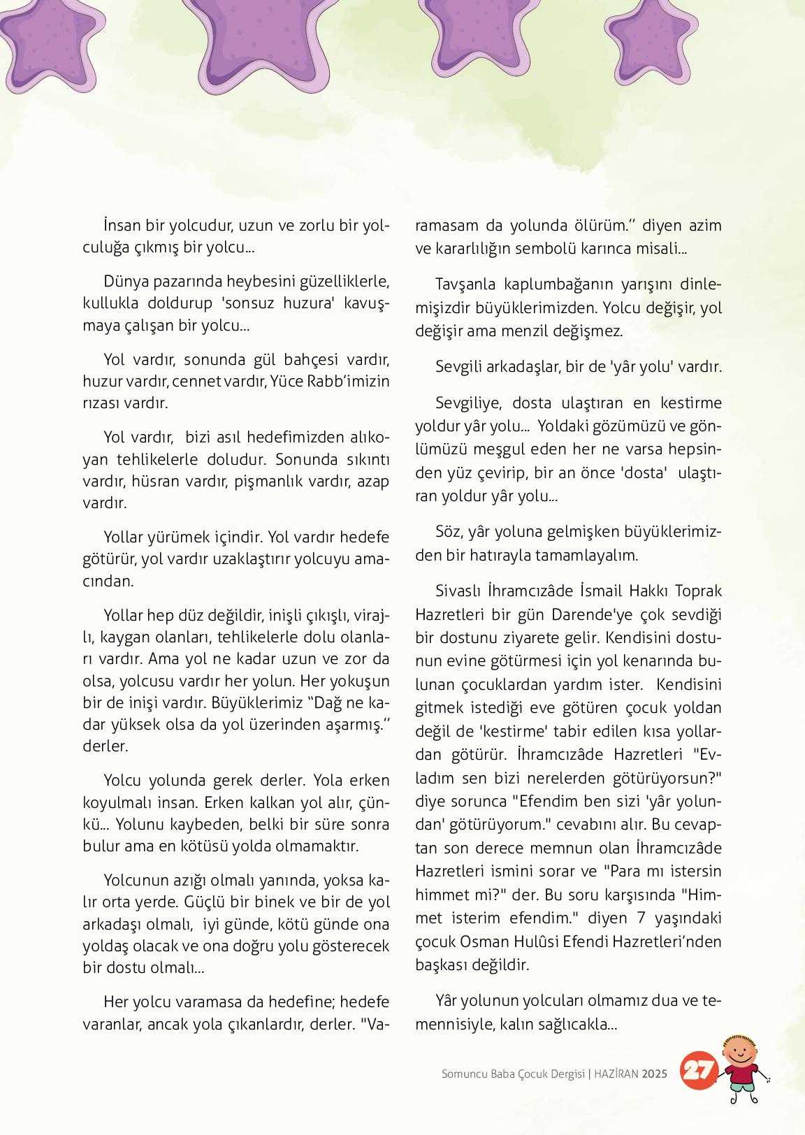 İnsan bir yolcudur, uzun ve zorlu bir yolculuğa çıkmış bir yolcu...Dünya pazarında heybesini güzelliklerle, kullukla doldurup 'sonsuz huzura' kavuşmaya çalışan bir yolcu...Yol vardır, sonunda gül bahçesi vardır, huzur vardır, cennet vardır, Yüce Rabb’imizin rızası vardır.Yol vardır, bi...