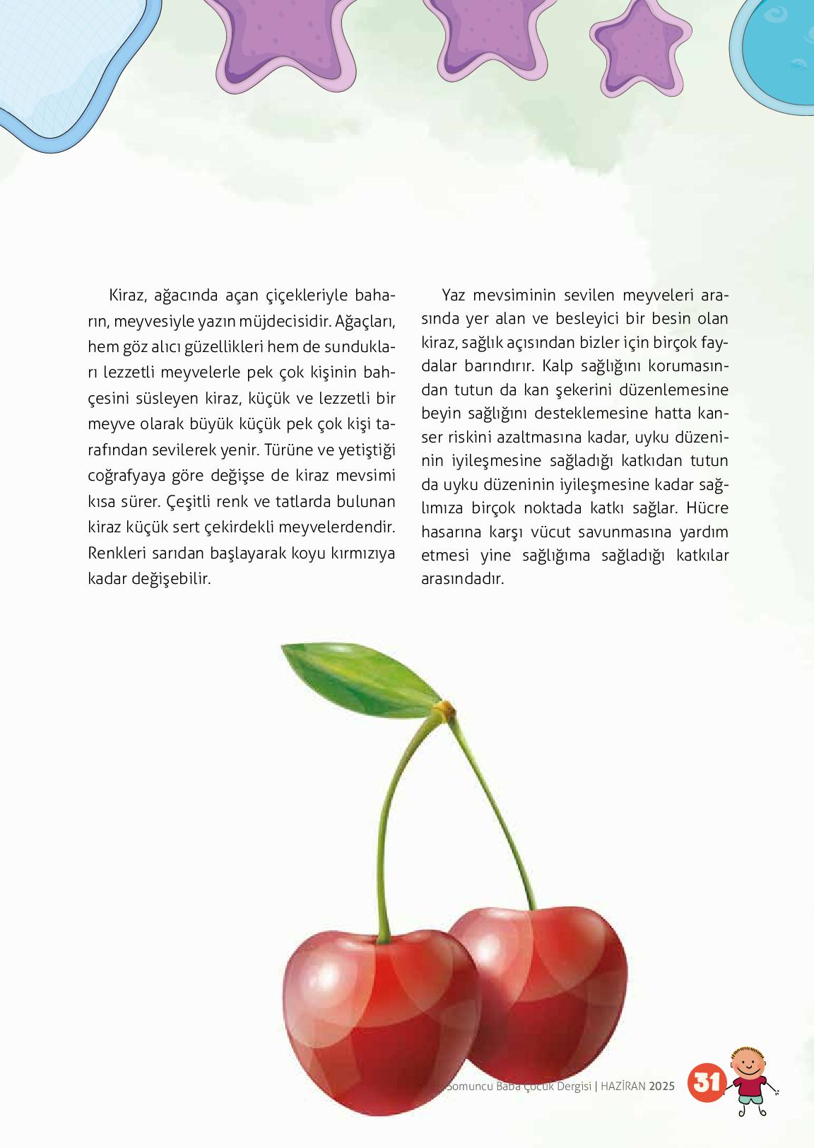 Kiraz, ağacında açan çiçekleriyle baharın, meyvesiyle yazın müjdecisidir. Ağaçları, hem göz alıcı güzellikleri hem de sundukları lezzetli meyvelerle pek çok kişinin bahçesini süsleyen kiraz, küçük ve lezzetli bir meyve olarak büyük küçük pek çok kişi tarafından sevilerek ye...