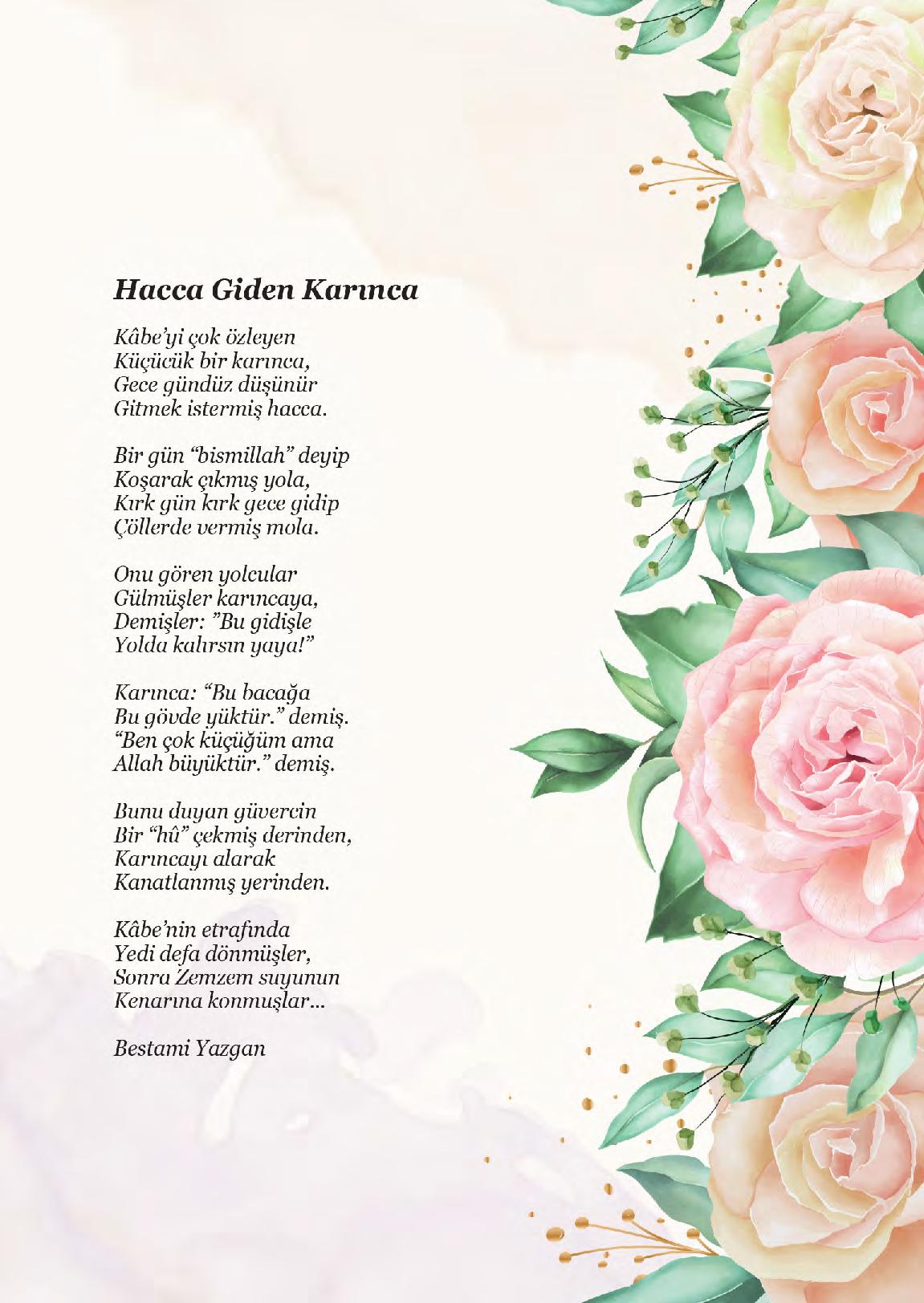 Kâbe’yi çok özleyenKüçücük bir karınca,Gece gündüz düşünürGitmek istermiş hacca.Bir gün “bismillah” deyipKoşarak çıkmış yola,Kırk gün kırk gece gidipÇöllerde vermiş mola.Onu gören yolcularGülmüşler karıncaya,Demişler: ”Bu gidişleYolda kalırsın yaya!”Karınca: “Bu bacağaBu gövde yük...