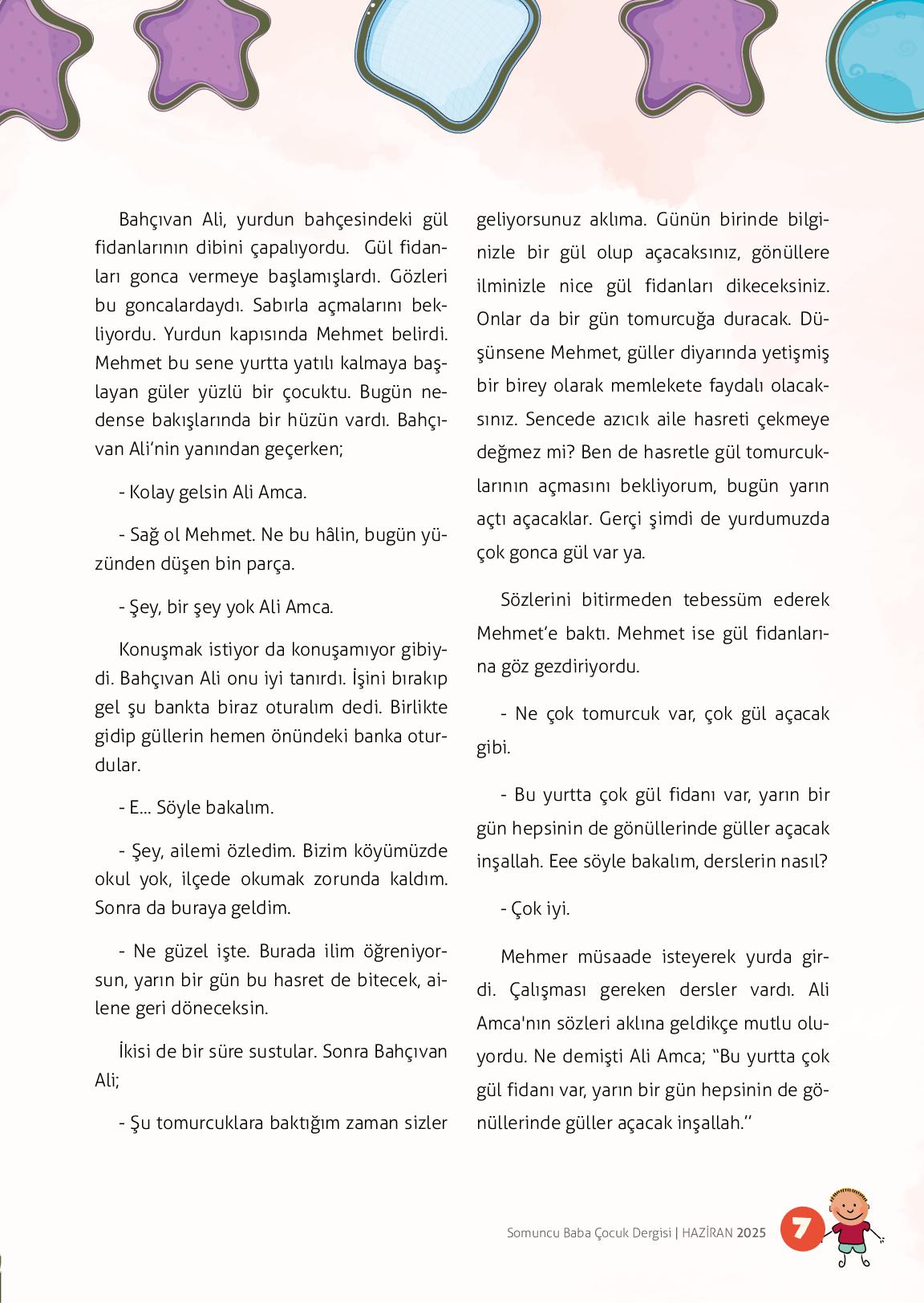 Bahçıvan Ali, yurdun bahçesinde ki gül fidanlarının dibini çapalıyordu. Gül fidanları gonca vermeye başlamışlardı. Gözleri bu goncalardaydı. Sabırla açmalarını bekliyordu. Yurdun kapısında Mehmet belirdi. Mehmet bu sene yurtta yatılı kalmaya başlayan güler yüzlü bir çocuktu....