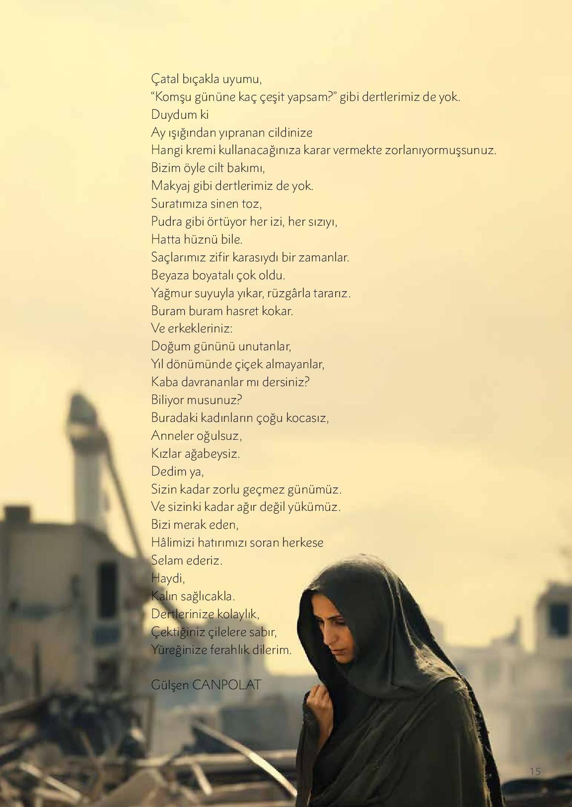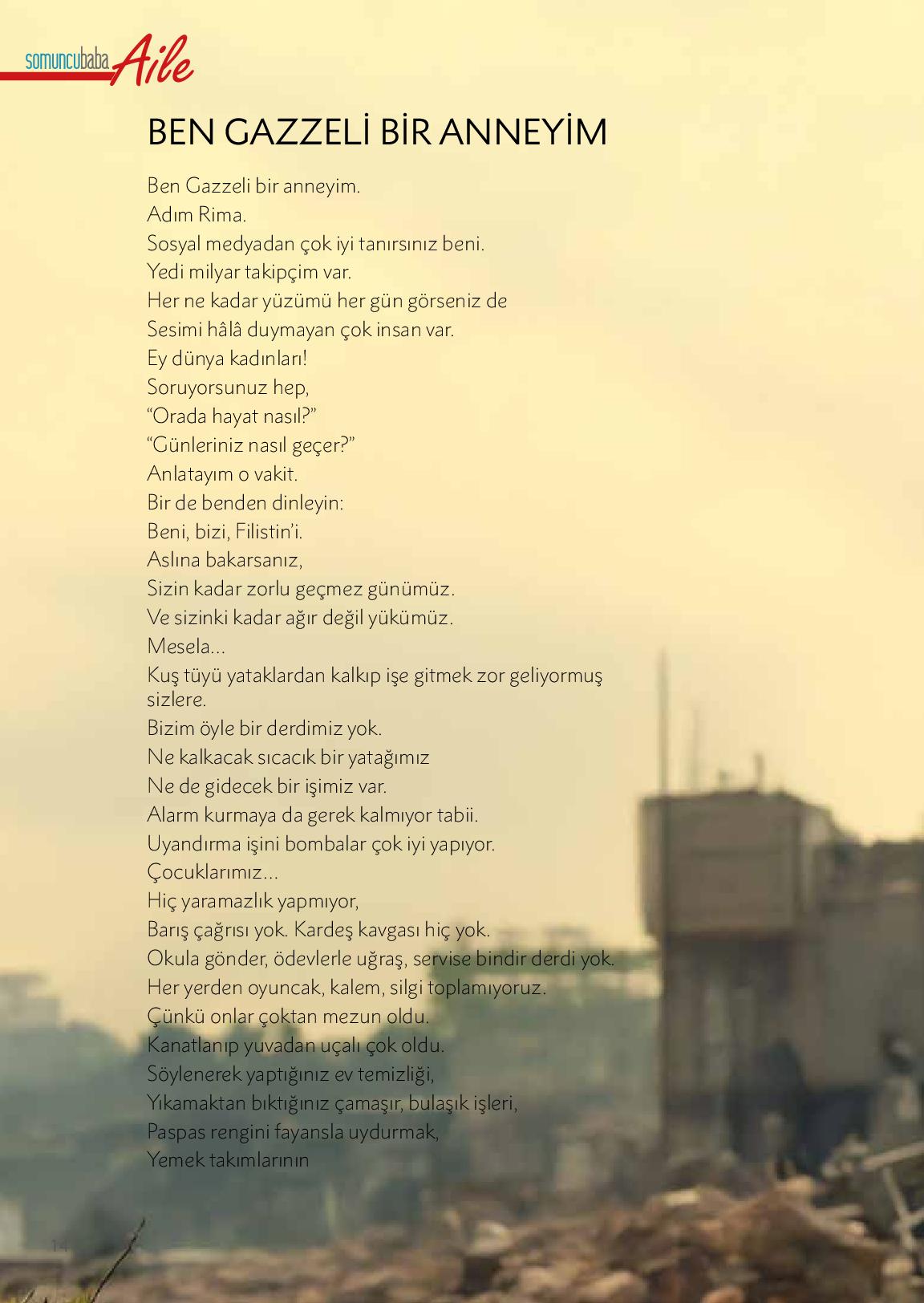 Ben Gazzeli bir anneyim.Adım Rima.Sosyal medyadan çok iyi tanırsınız beni.Yedi milyar takipçim var.Her ne kadar yüzümü her gün görseniz de,Sesimi hâlâ duymayan çok insan var.Ey dünya kadınları!Soruyorsunuz hep,“Orada hayat nasıl?”“Günleriniz nasıl geçer?”Anlatayım o vaki...