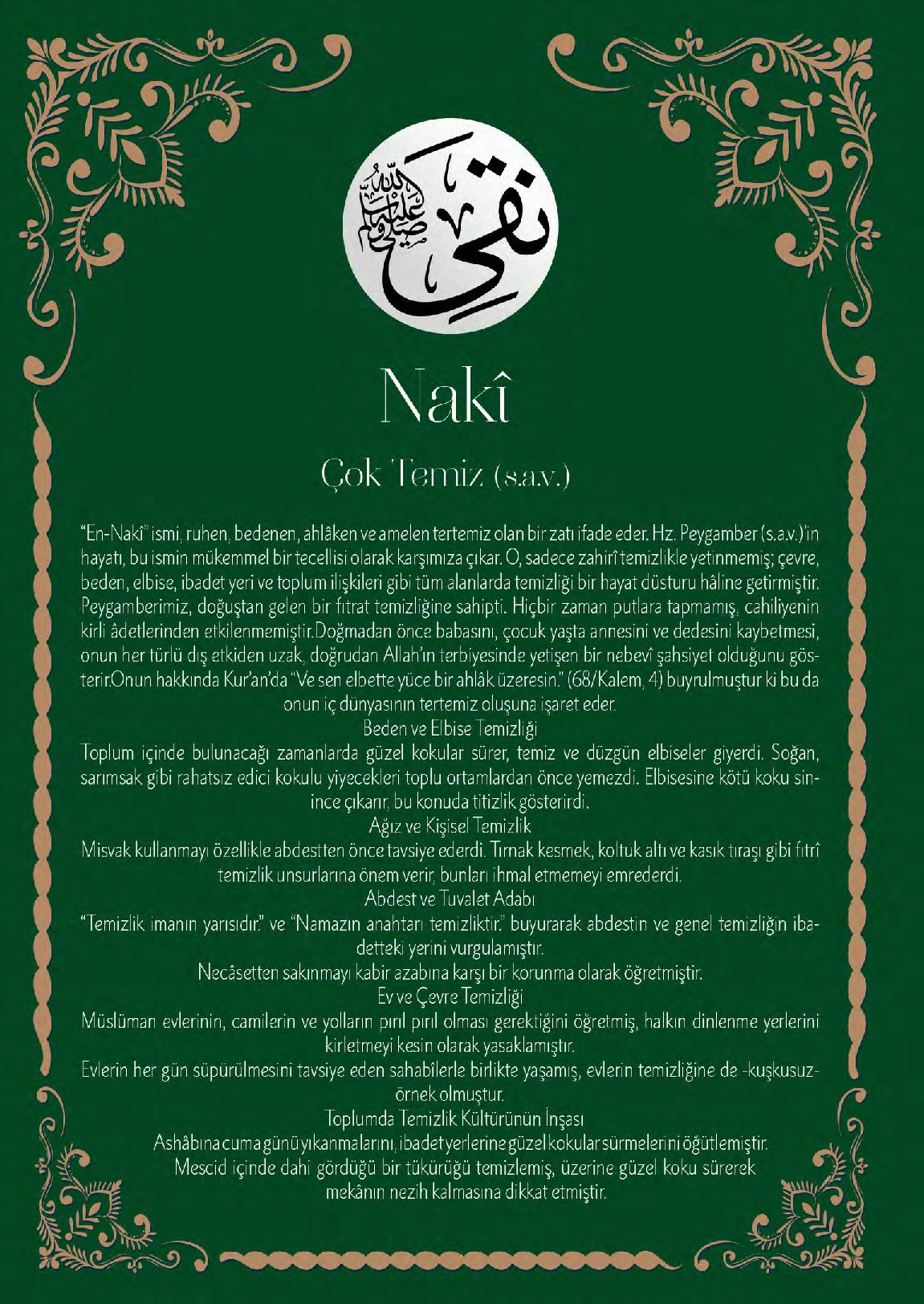 “En-Nakî” ismi, ruhen, bedenen, ahlâken ve amelen tertemiz olan bir zatı ifade eder. Hz. Peygamber (s.a.v.)’in hayatı, bu ismin mükemmel bir tecellisi olarak karşımıza çıkar. O, sadece zahirî temizlikle yetinmemiş; çevre, beden, elbise, ibadet yeri ve toplum ilişkileri gibi tüm alan...