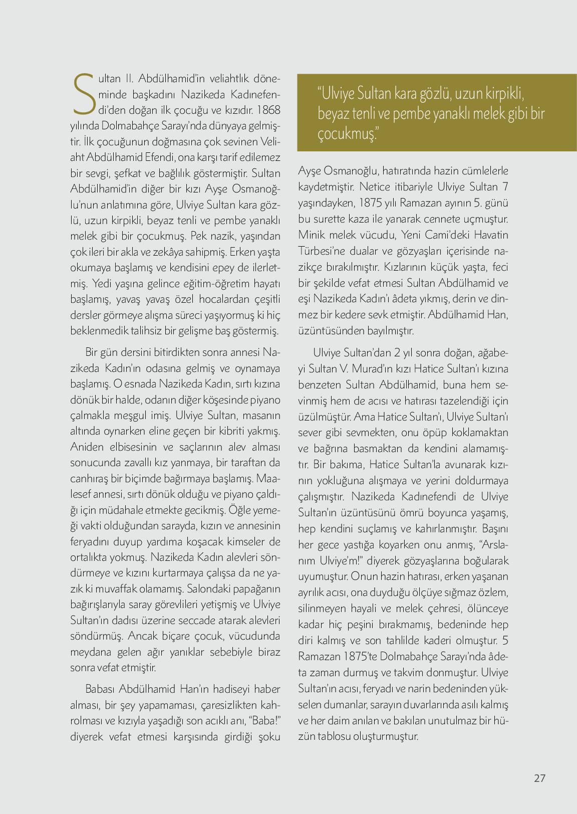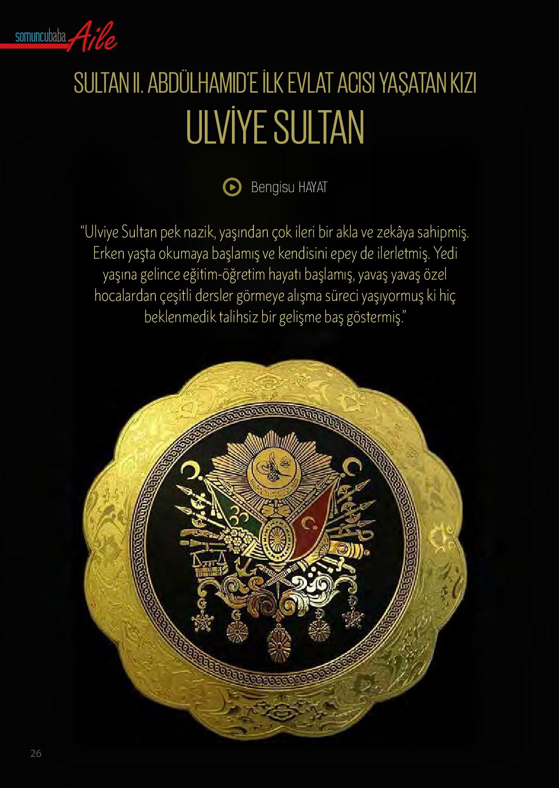 Sultan II. Abdülhamid’e İlk Evlat Acısı Yaşatan Kızı Ulviye SultanSultan II. Abdülhamid’in veliahtlık döneminde başkadını Nazikeda Kadınefendi’den doğan ilk çocuğu ve kızıdır. 1868 yılında Dolmabahçe Sarayı’nda dünyaya gelmiştir. İlk çocuğunun doğmasına çok sevinen Veliaht Abdülhamid Ef...