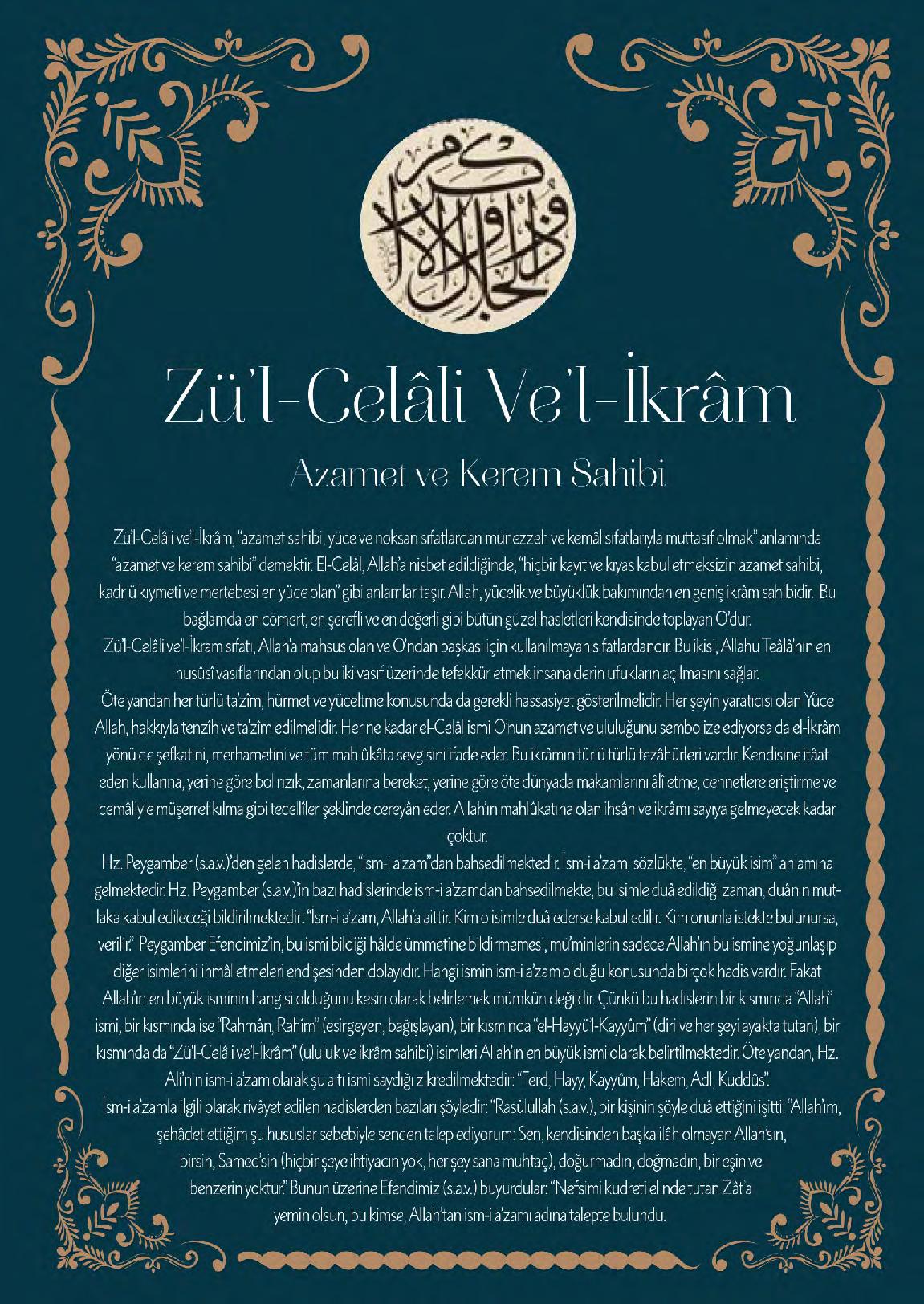 Zü’l-Celâli Ve’l-İkrâm: Azamet ve Kerem SahibiZü’l-Celâli ve’l-İkrâm, “azamet sahibi, yüce ve noksan sıfatlardan münezzeh ve kemâl sıfatlarıyla muttasıf olmak” anlamında “azamet ve kerem sahibi” demektir. El-Celâl, Allah’a nisbet edildiğinde, “hiçbir kayıt ve kıy...