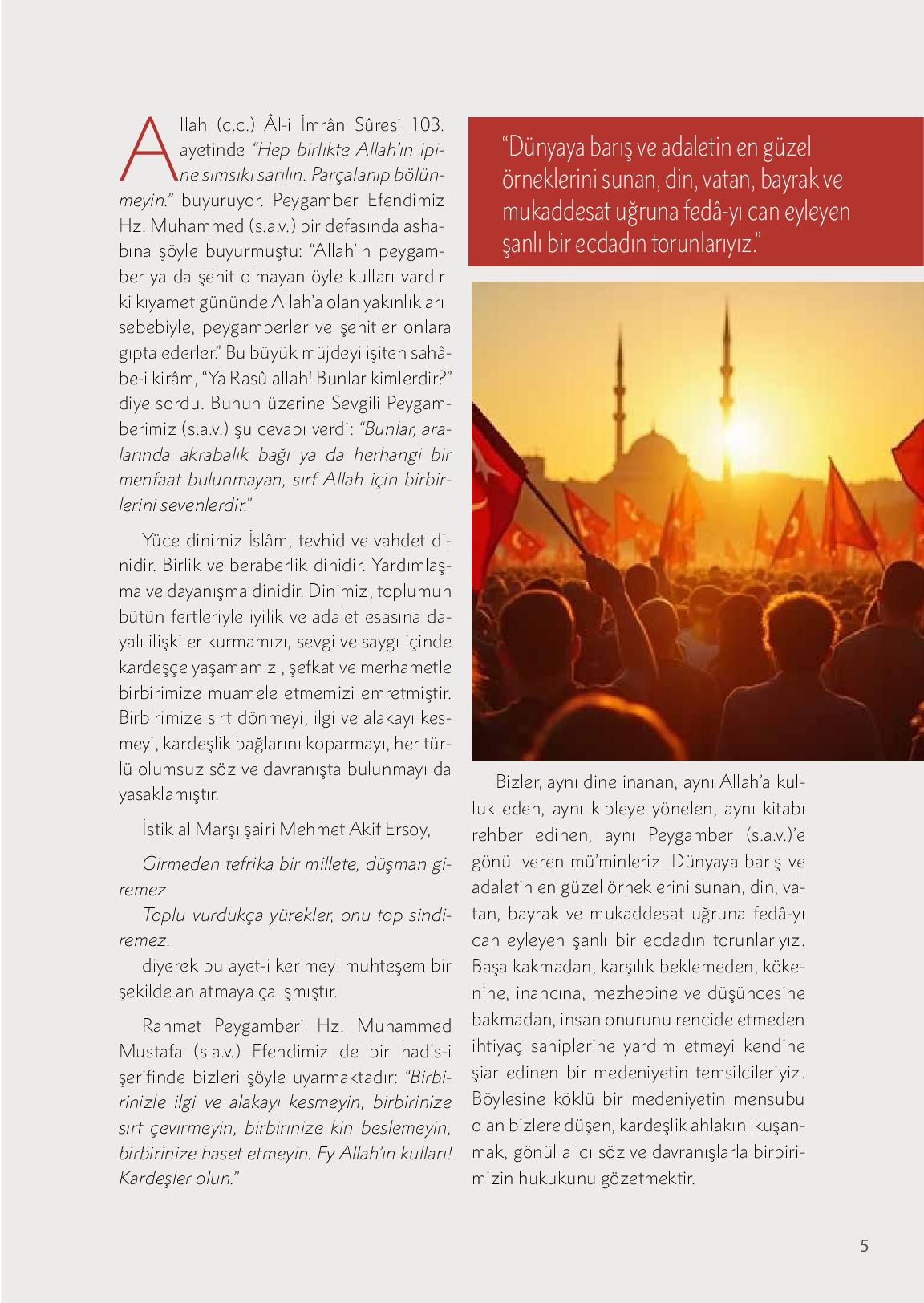Allah (c.c.) Âl-i İmrân Sûresi 103. ayetinde "Hep birlikte Allah’ın ipine sımsıkı sarılın. Parçalanıp bölünmeyin.” buyuruyor. Peygamber Efendimiz Hz. Muhammed (s.a.v.) bir defasında ashabına şöyle buyurmuştu: “Allah’ın peygamber ya da şehit olmayan öyle kulları vardır ki kıy...
