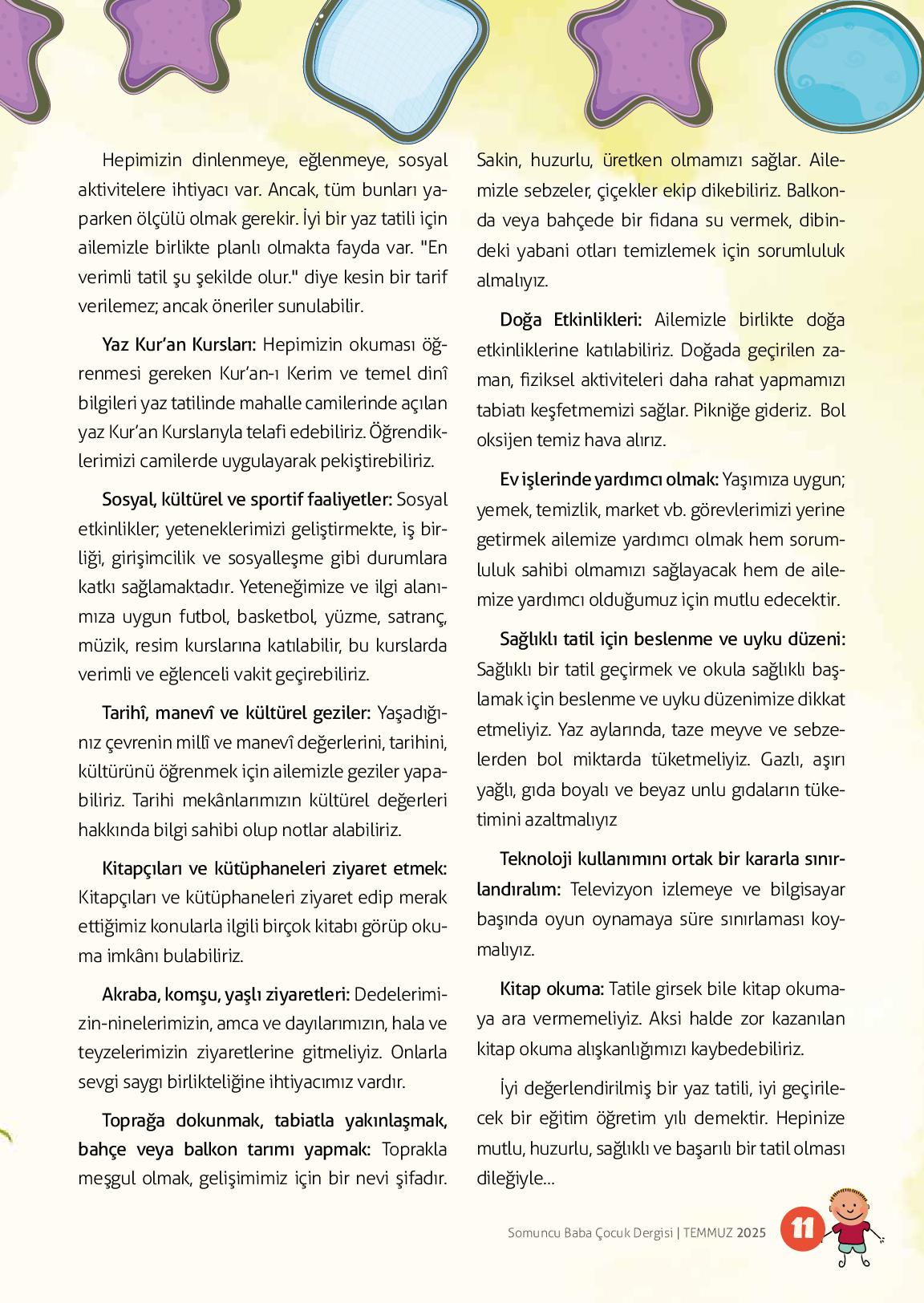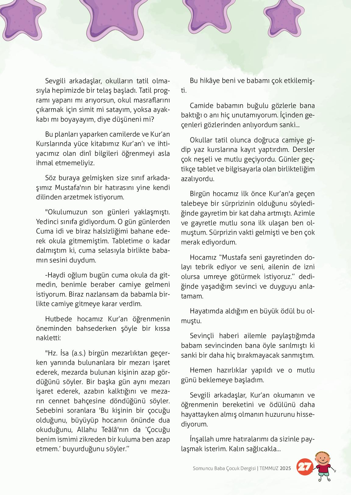 Sevgili arkadaşlar, okulların tatil olmasıyla hepimizde bir telaş başladı. Tatil programı yapanı mı arıyorsun, okul masraflarını çıkarmak için simit mi satayım, yoksa ayakkabı mı boyayayım, diye düşüneni mi?Bu planları yaparken camilerde ve Kur’an Kurslarında yüce kitabımız Kur’an’ı ve ...