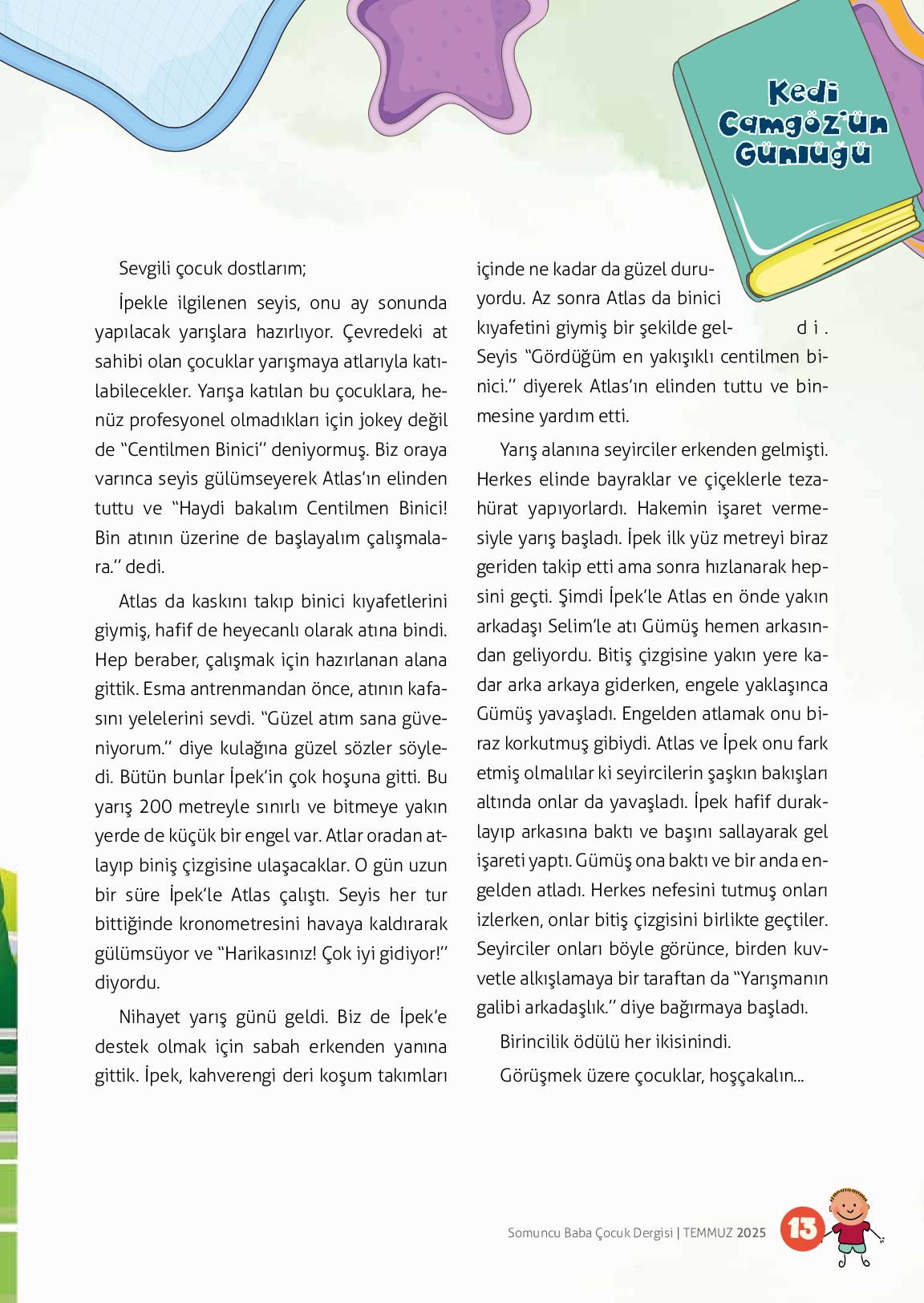 Sevgili çocuk dostlarım;İpekle ilgilenen seyis, onu ay sonunda yapılacak yarışlara hazırlıyor. Çevredeki at sahibi olan çocuklar yarışmaya atlarıyla katılabilecekler. Yarışa katılan bu çocuklara, henüz profesyonel olmadıkları için jokey değil de “Centilmen Binici” d...