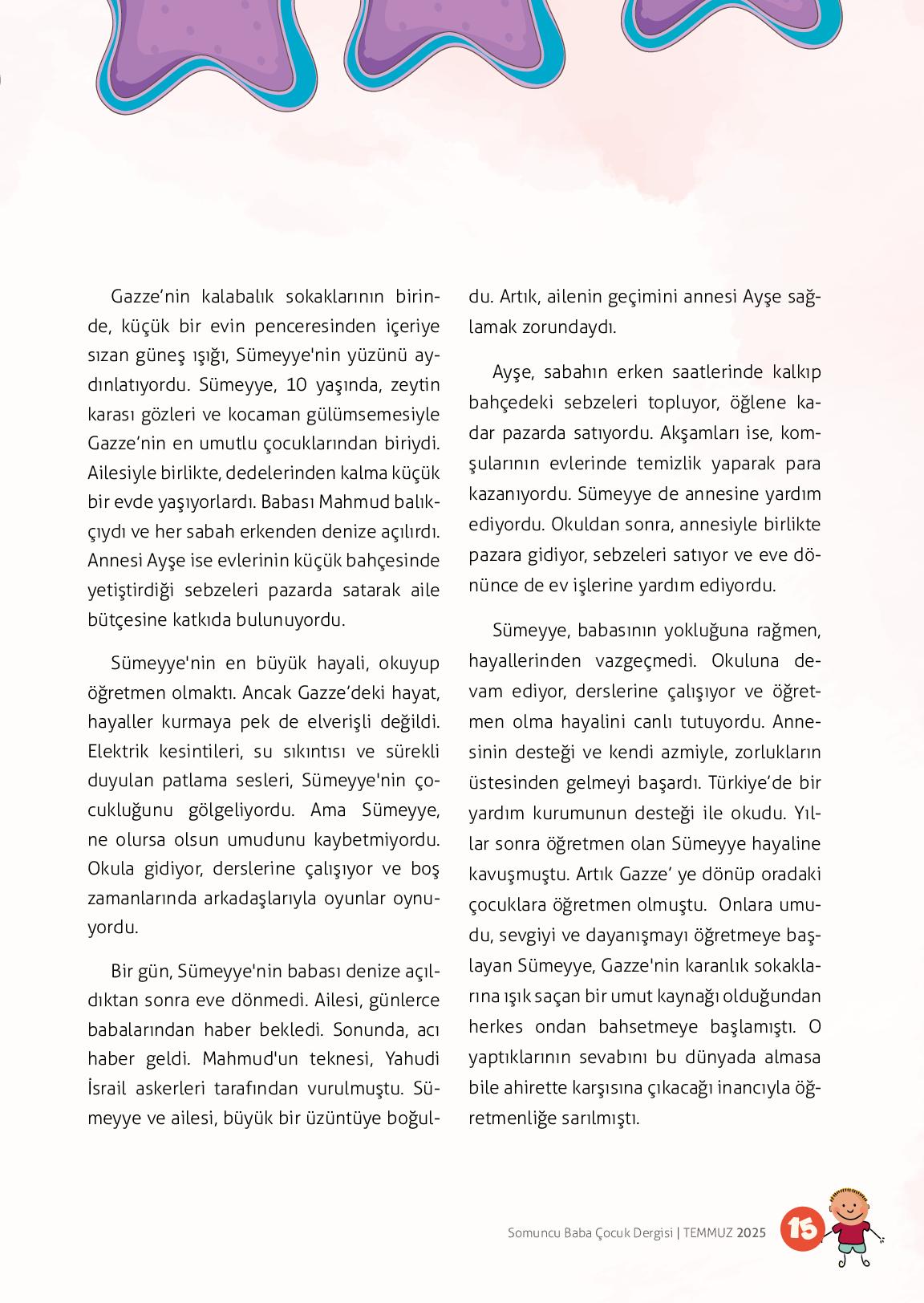 Gazze’nin kalabalık sokaklarının birinde, küçük bir evin penceresinden içeriye sızan güneş ışığı, Sümeyye'nin yüzünü aydınlatıyordu. Sümeyye, 10 yaşında, zeytin karası gözleri ve kocaman gülümsemesiyle Gazze’nin en umutlu çocuklarından biriydi. Ailesiyle birlikte, dedelerinden kalma ...