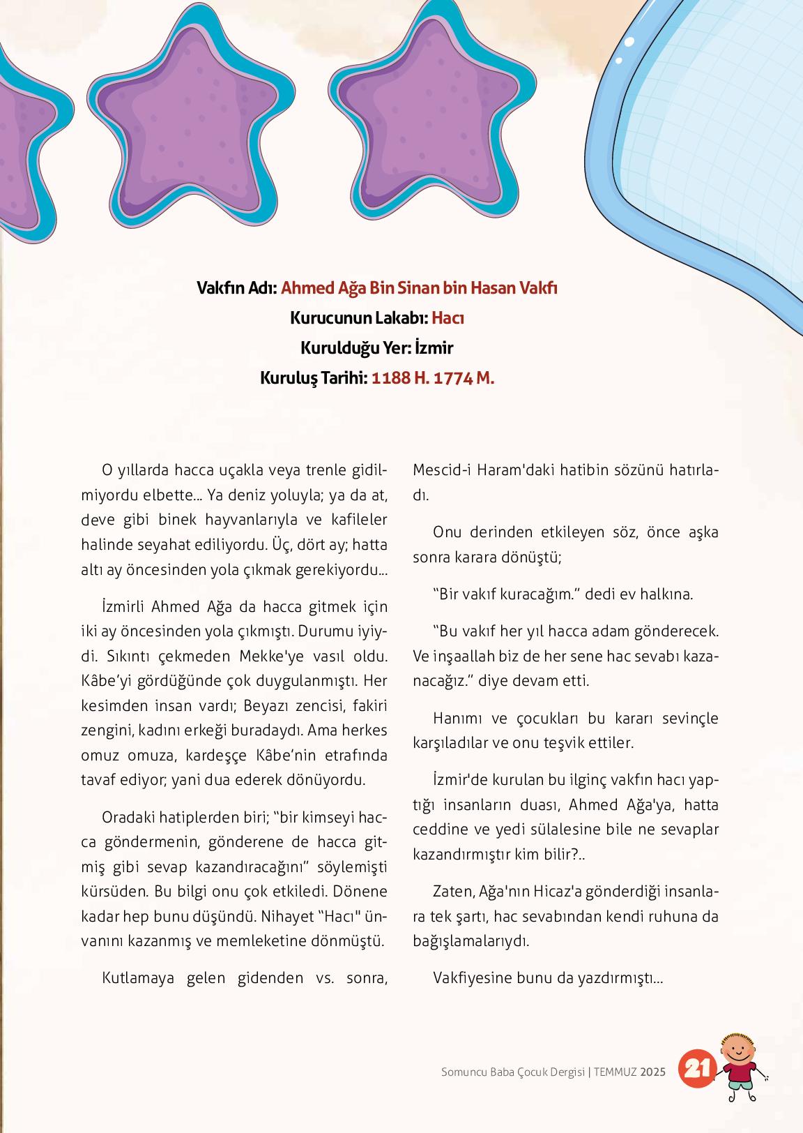 Vakfın Adı: Ahmed Ağa Bin Sinan bin Hasan VakfıKurucunun Lakabı: HacıKurulduğu Yer: İzmirKuruluş Tarihi: 1188 H. 1774 M.O yıllarda hacca uçakla veya trenle gidilmiyordu elbette... Ya deniz yoluyla; ya da at, deve gibi binek hayvanlarıyla ve kafileler halinde seyahat edi...