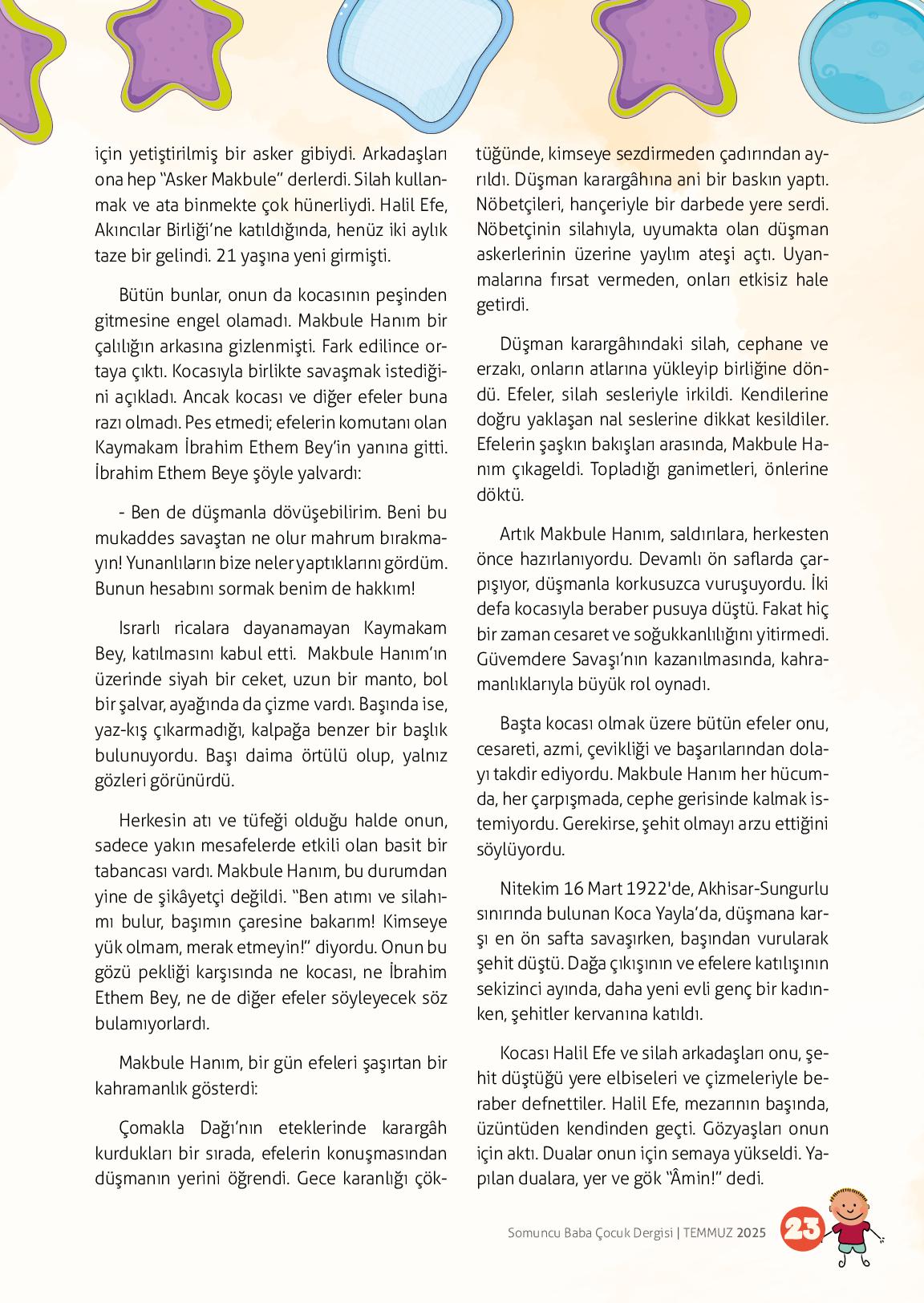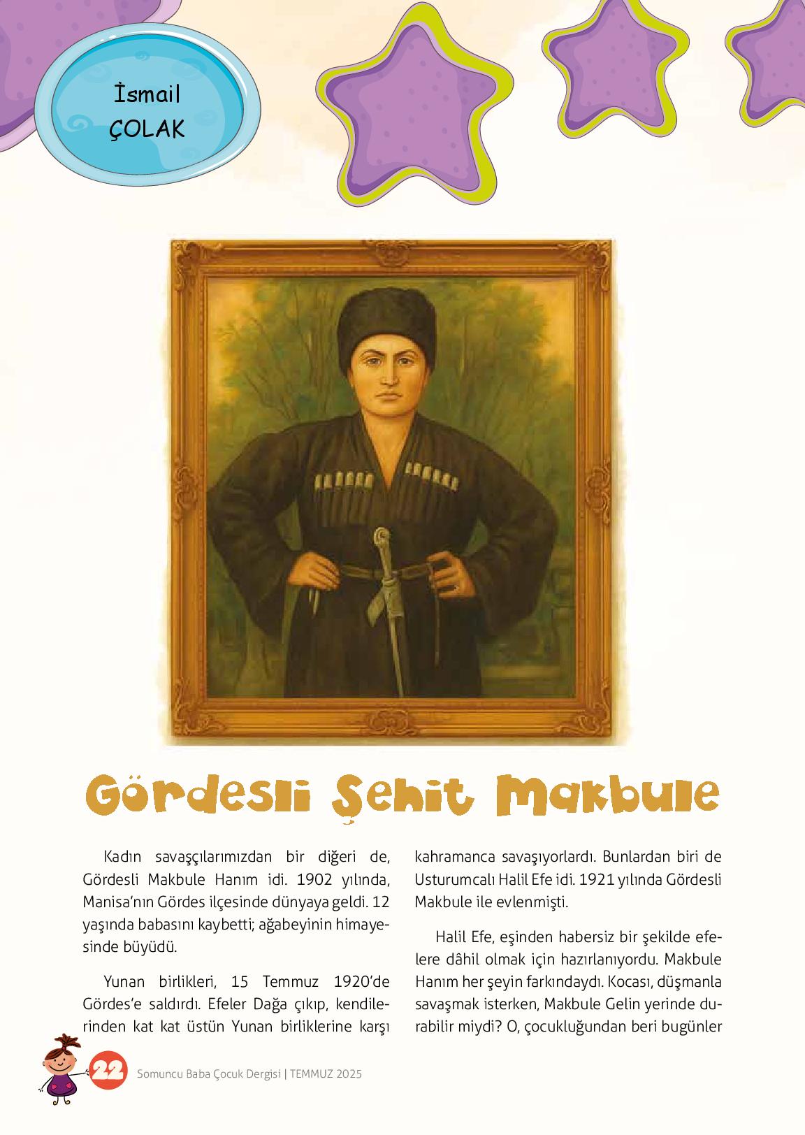 Kadın savaşçılarımızdan bir diğeri de, Gördesli Makbule Hanım idi. 1902 yılında, Manisa’nın Gördes ilçesinde dünyaya geldi. 12 yaşında babasını kaybetti; ağabeyinin himayesinde büyüdü.Yunan birlikleri, 15 Temmuz 1920’de Gördes’e saldırdı. Efeler Dağa çıkıp, kendilerinden kat ka...