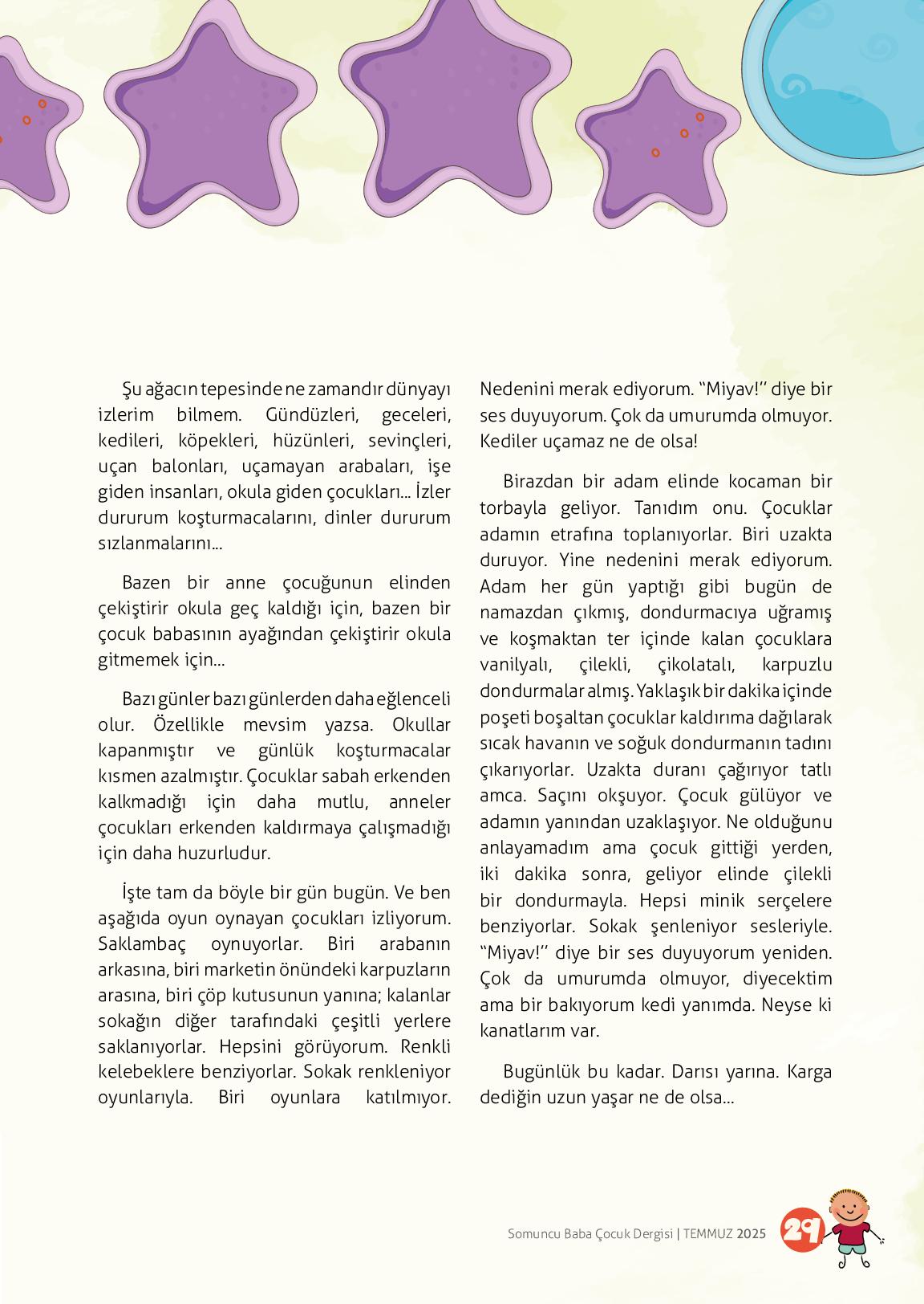 Şu ağacın tepesinde ne zamandır dünyayı izlerim bilmem. Gündüzleri, geceleri, kedileri, köpekleri, hüzünleri, sevinçleri, uçan balonları, uçamayan arabaları, işe giden insanları, okula giden çocukları... İzler dururum koşturmacalarını, dinler dururum sızlanmalarını...Bazen bir anne çocuğu...