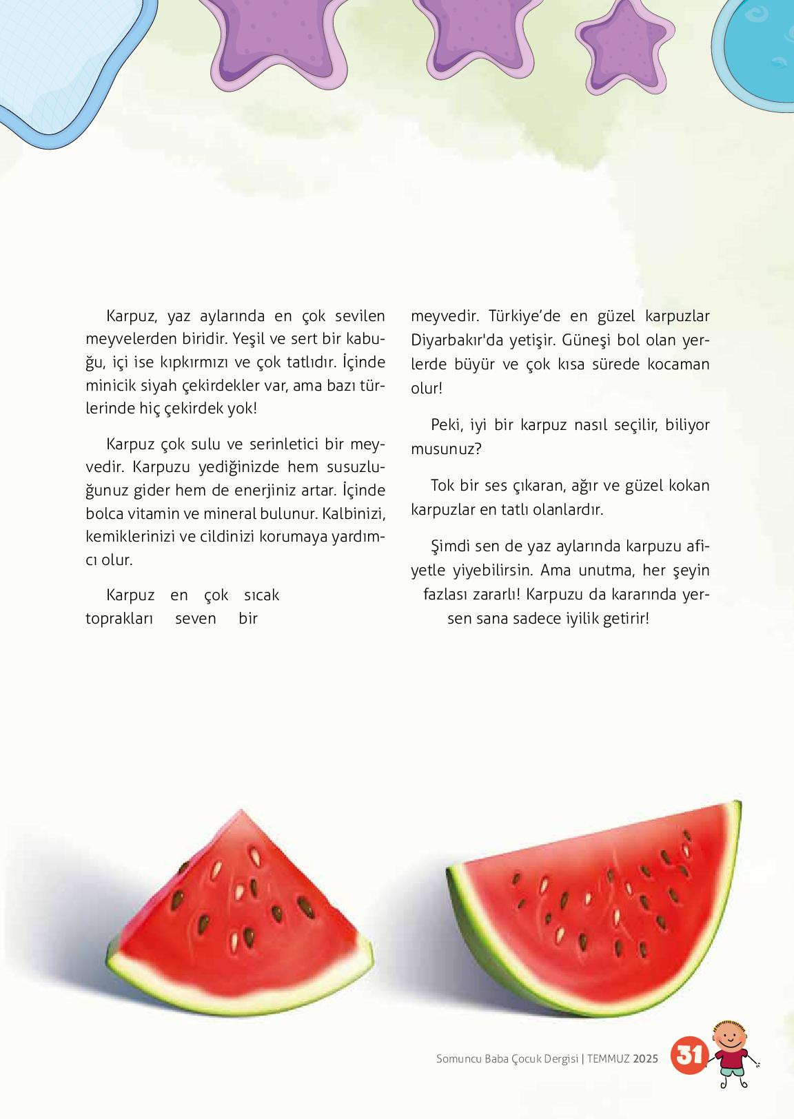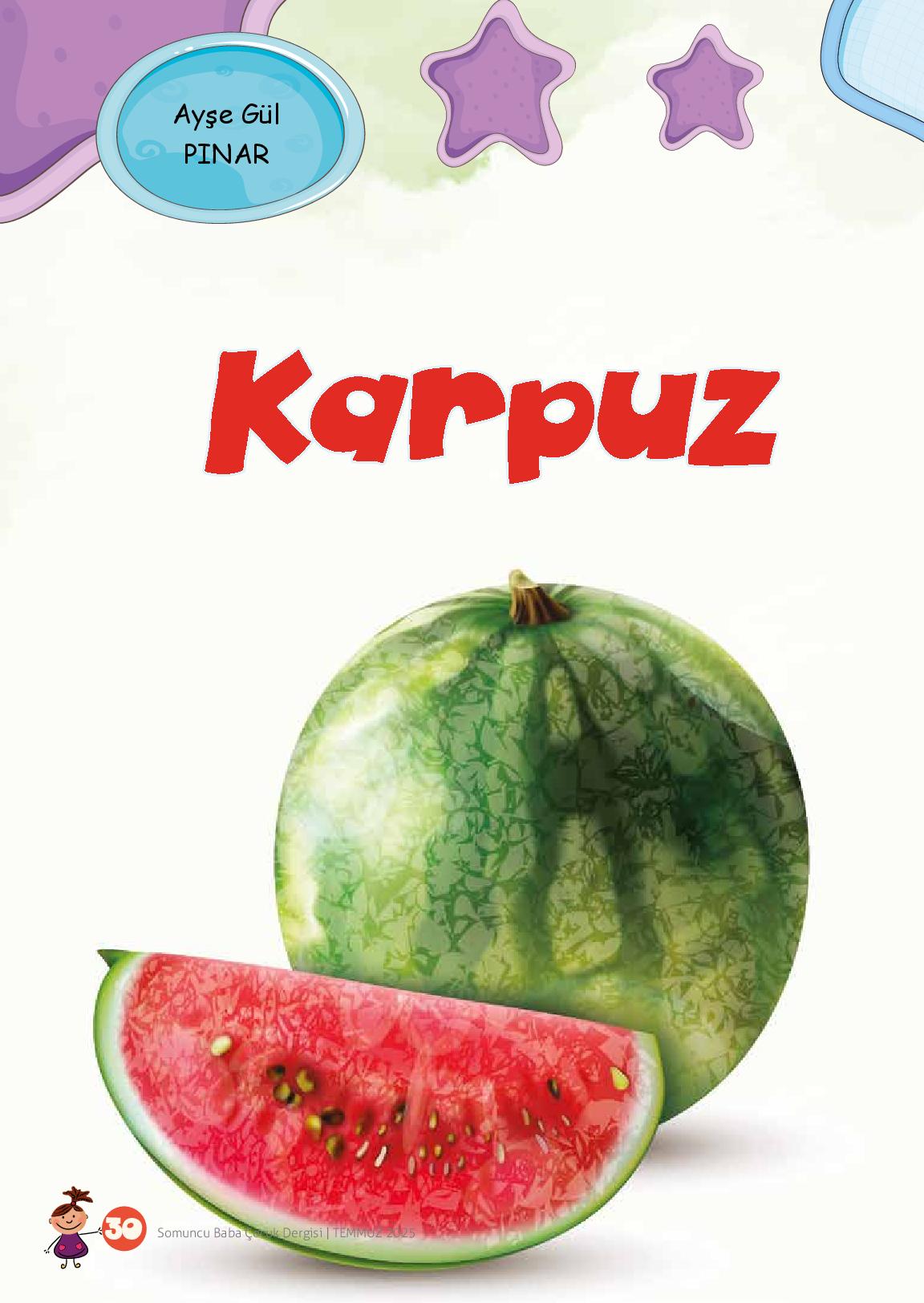Karpuz, yaz aylarında en çok sevilen meyvelerden biridir. Yeşil ve sert bir kabuğu, içi ise kıpkırmızı ve çok tatlıdır. İçinde minicik siyah çekirdekler var, ama bazı türlerinde hiç çekirdek yok!Karpuz çok sulu ve serinletici bir meyvedir. Karpuzu yediğinizde hem susuzluğu...