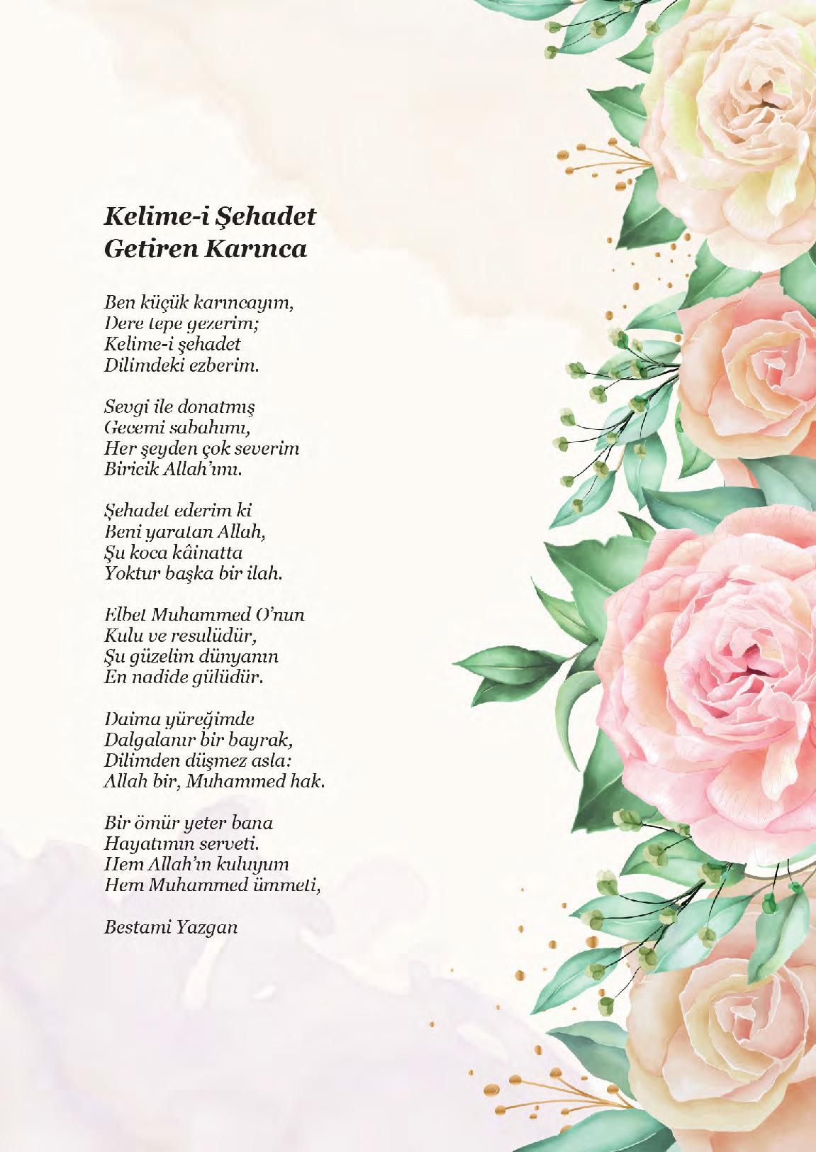 Ben küçük karıncayım,Dere tepe gezerim;Kelime-i şehadetDilimdeki ezberim.Sevgi ile donatmışGecemi sabahımı,Her şeyden çok severimBiricik Allah’ımı.Şehadet ederim kiBeni yaratan Allah,Şu koca kâinattaYoktur başka bir ilah.Elbet Muhammed O’nunKulu ve resulüdür,Şu güzeli...