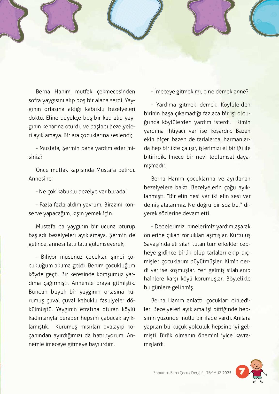 Berna Hanım mutfak çekmecesinden sofra yaygısını alıp boş bir alana serdi. Yaygının ortasına aldığı kabuklu bezelyeleri döktü. Eline büyükçe boş bir kap alıp yaygının kenarına oturdu ve başladı bezelyeleri ayıklamaya. Bir ara çocuklarına seslendi;-Mustafa, Şermin bana yardım eder misiniz?Önce ...
