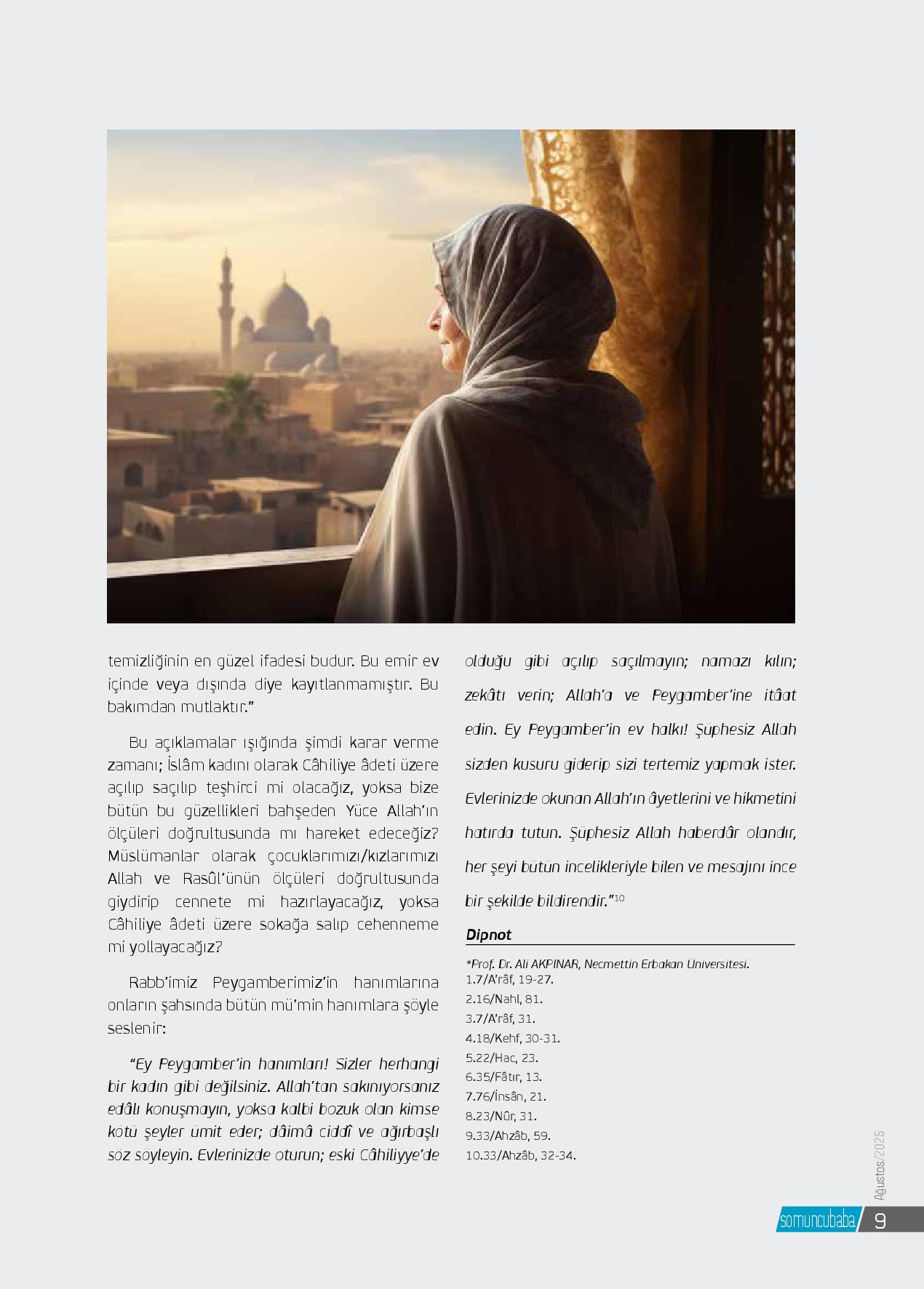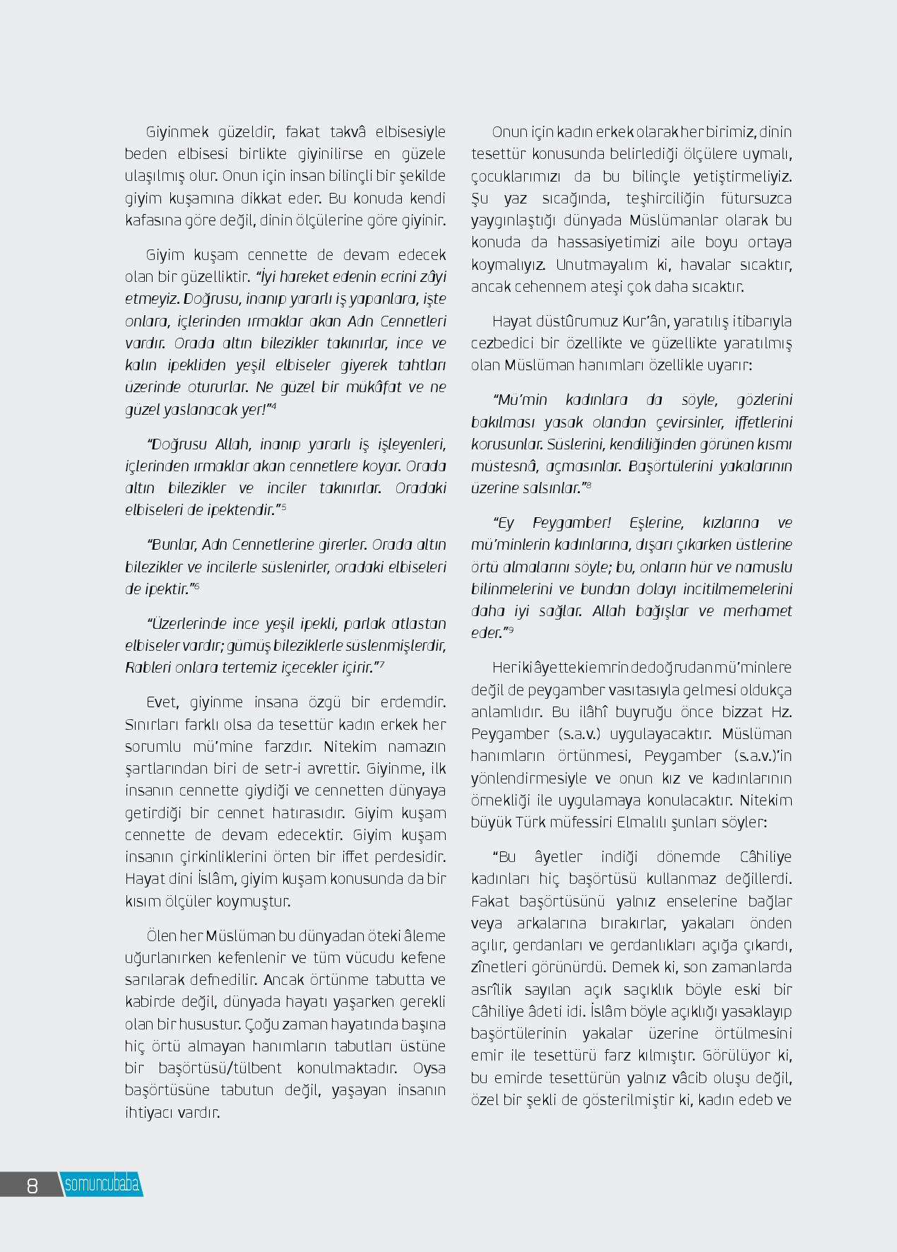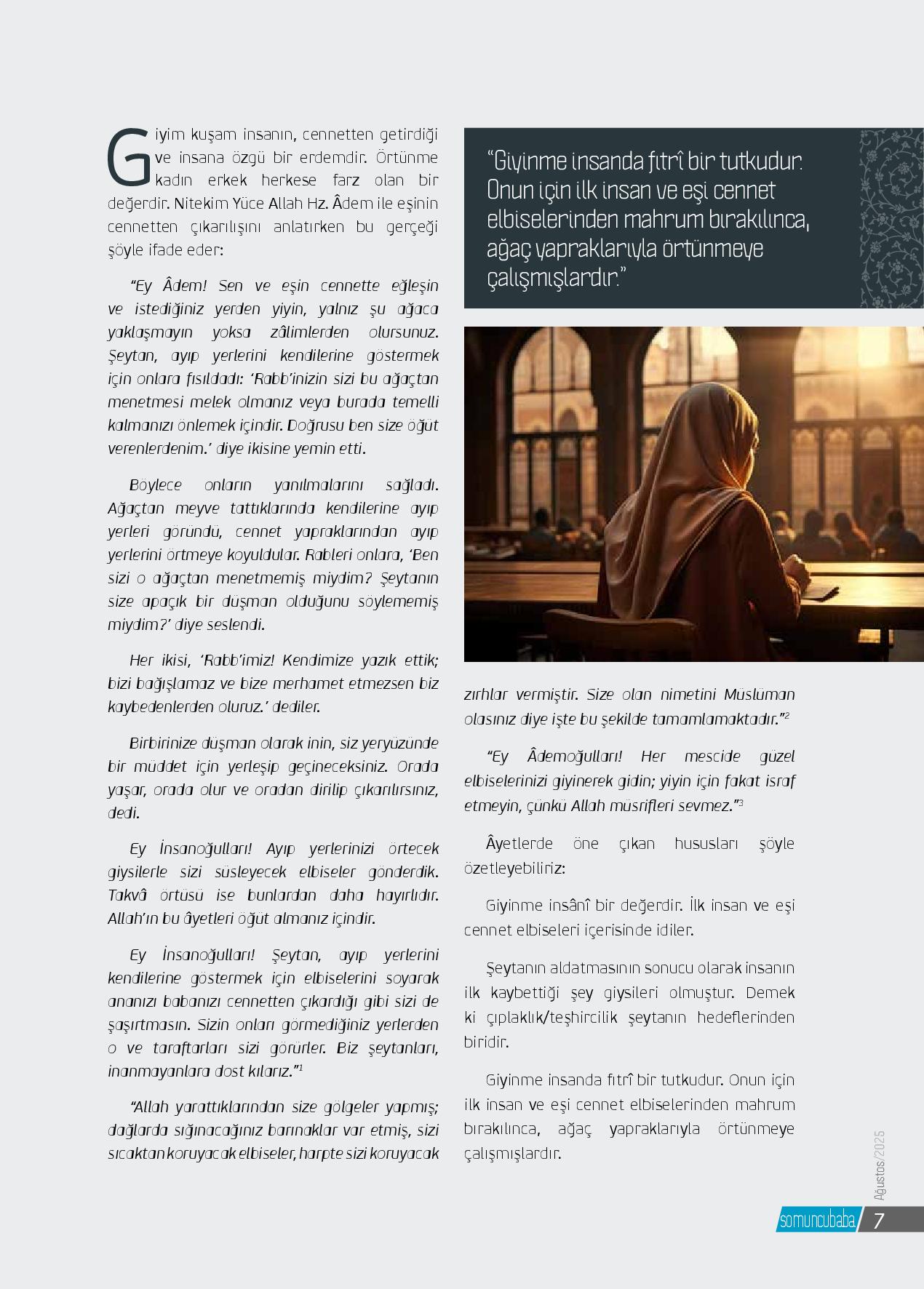 Giyim kuşam insanın, cennetten getirdiği ve insana özgü bir erdemdir. Örtünme kadın erkek herkese farz olan bir değerdir. Nitekim Yüce Allah Hz. Âdem ile eşinin cennetten çıkarılışını anlatırken bu gerçeği şöyle ifade eder:“Ey Âdem! Sen ve eşin cennette eğleşin ve istediği...