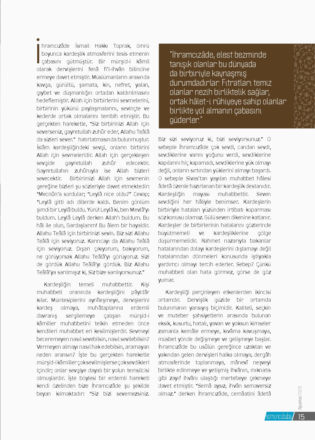 İhramcızâde İsmail Hakkı Toprak, ömrü boyunca kardeşlik atmosferini tesis etmenin çabasını gütmüştür. Bir mürşid-i kâmil olarak dervişlerini fenâ fi’l-ihvân bilincine ermeye davet etmiştir. Müslümanların arasında kavga, gürültü, şamata, kin, nefr...