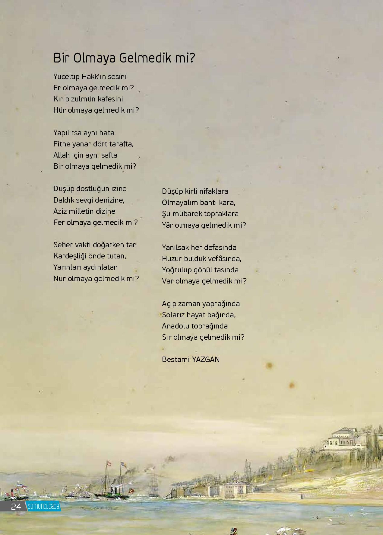 Yüceltip Hakk’ın sesiniEr olmaya gelmedik mi?Kırıp zulmün kafesiniHür olmaya gelmedik mi?Yapılırsa aynı hataFitne yanar dört tarafta,Allah için aynı saftaBir olmaya gelmedik mi?Düşüp dostluğun izineDaldık sevgi denizine,Aziz milletin dizineFer olmaya gelmedik mi?Seher vakti do...
