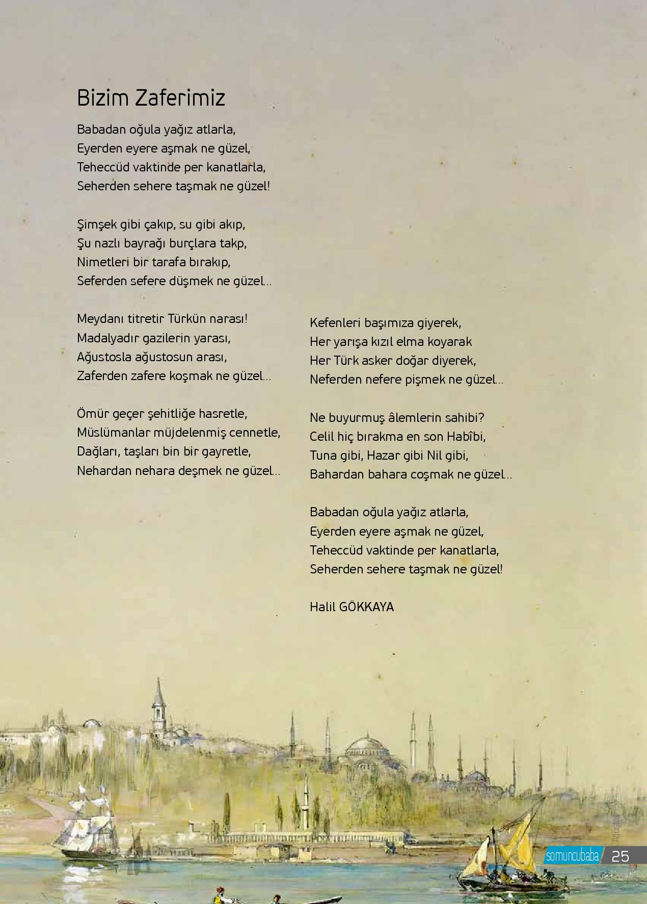 Babadan oğula yağız atlarla,Eyerden eyere aşmak ne güzel,Teheccüd vaktinde per kanatlarla,Seherden sehere taşmak ne güzel!Şimşek gibi çakıp, su gibi akıp,Şu nazlı bayrağı burçlara takp,Nimetleri bir tarafa bırakıp,Seferden sefere düşmek ne güzel...Meydanı titretir Türkün narası!Madaly...